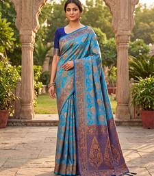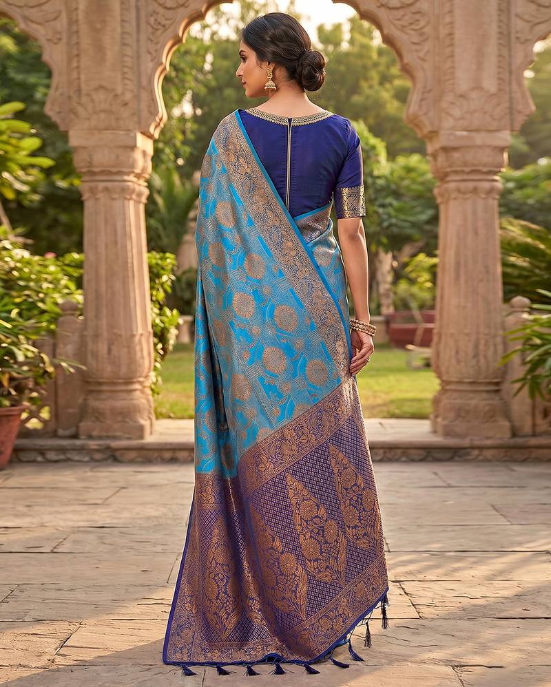Blue jacquard silk saree with rich zari work border with unstitched blouse piece