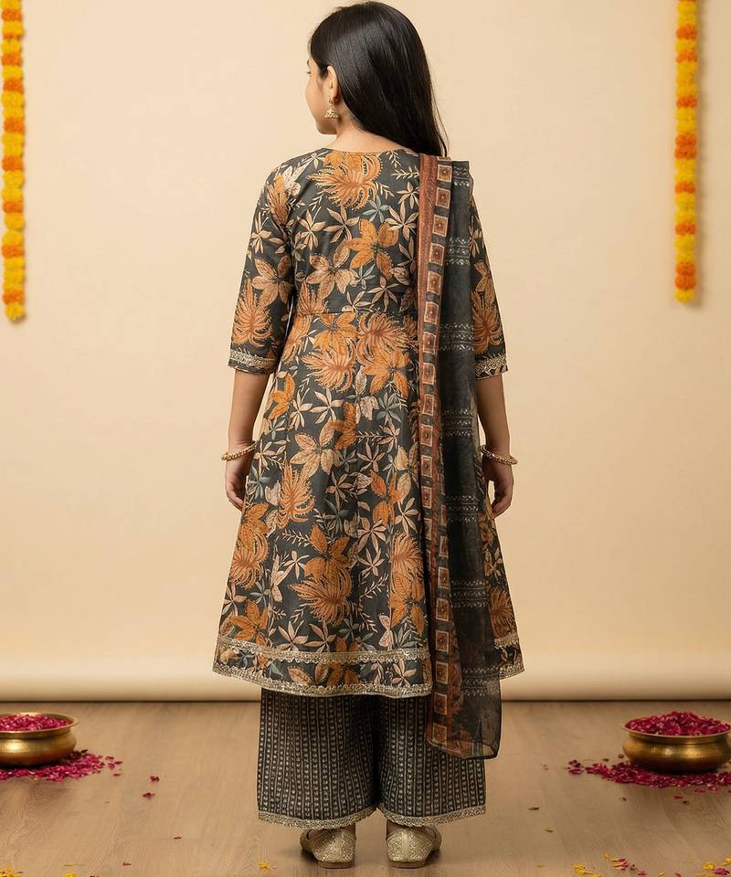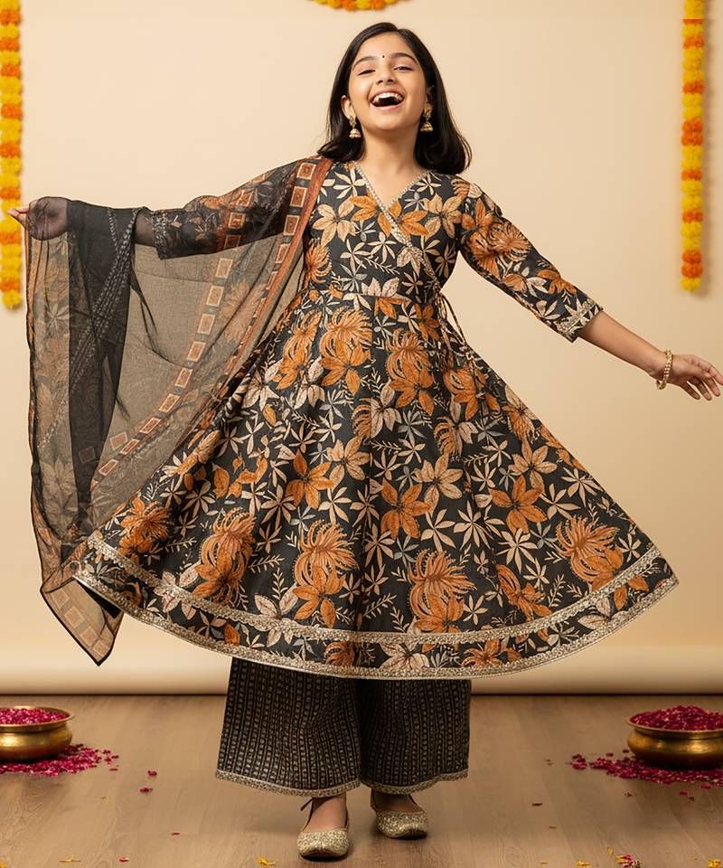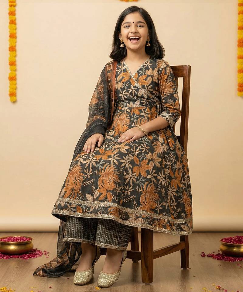 | Product Description | This Adorable Kids Anarkali Kurta Palazzo Set Is Crafted From Soft Cotton Blend Fabric, Ensuring All Day Comfort With A Graceful Look. Designed In A Stylish Angrakha Pattern, The Kurta Features Beautiful All Over Floral Prints With A Flared Silhouette And Elegant Border Detailing. It Is Paired With Matching Printed Palazzo Pants And A Lightweight Dupatta, Adding A Festive And Traditional Touch. Perfect For Festivals, Family Functions, And Special Occasions, This Outfit Offers A Charming And Trendy Ethnic Look For Kids.Kids Anarkali Kurta Set, Kids Kurta Palazzo Set, Kids Ethnic Wear, Girls Festive Wear, Kids Party Wear Dress, Cotton Blend Kurta Set, Angrakha Style Kurta, Printed Anarkali Dress For Kids, Girls Traditional Wear, Kids Designer Kurta Set, Festive Wear Kids Outfit, Ethnic Wear For Girls, Kids Wedding Wear Dress, Trendy Kids Kurta Set, Comfortable Cotton Ethnic Set |