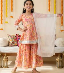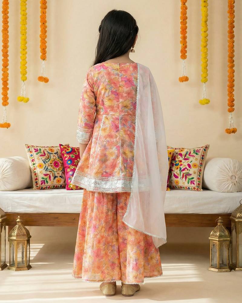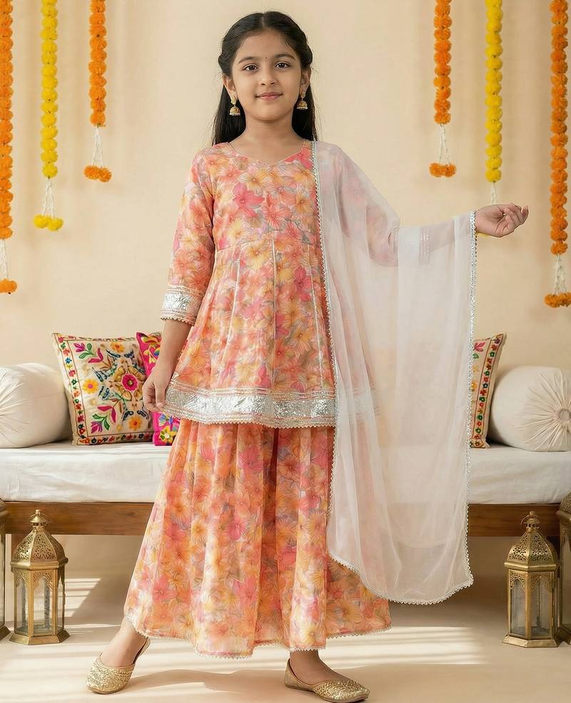| Product Description | Beautiful Girl’s Kurta Sharara Set Crafted From Soft Silk Blend Fabric With A Light Festive Shine. The Kurta Features Vibrant Floral Prints With Delicate Lace And Border Detailing On The Sleeves And Hem For An Elegant Look. Paired With A Flared Sharara Showcasing Matching Print And Flowy Silhouette For A Stylish Appearance. Comes With A Lightweight Georgette Dupatta With Fine Edging, Adding A Graceful And Complete Ethnic Touch. |