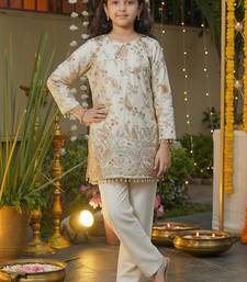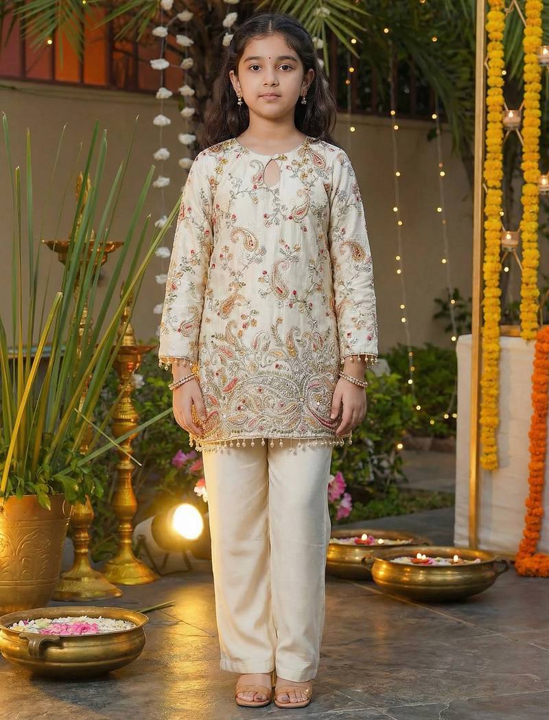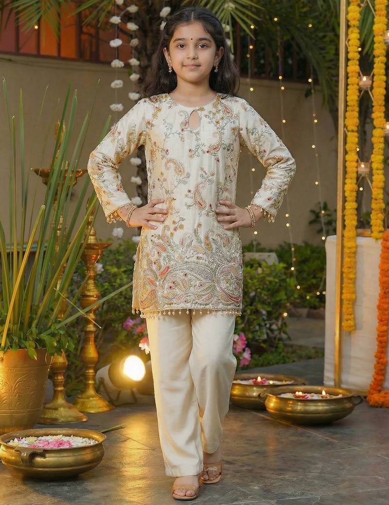 | Product Description | This Elegant Girl’s Kurta Pant Set Is Crafted From Heavy French Crepe, Offering A Soft, Fluid Drape With A Premium Feel. The Kurta Features Intricate All Over Embroidery Work With Graceful Floral And Paisley Inspired Patterns, Adding Rich Ethnic Detailing. Designed With A Straight Silhouette, It Creates A Refined And Flattering Appearance. Paired With A Matching Solid Pant, This Ensemble Delivers A Sophisticated, Festive Ready Look Perfect For Celebrations And Special Occasions. |