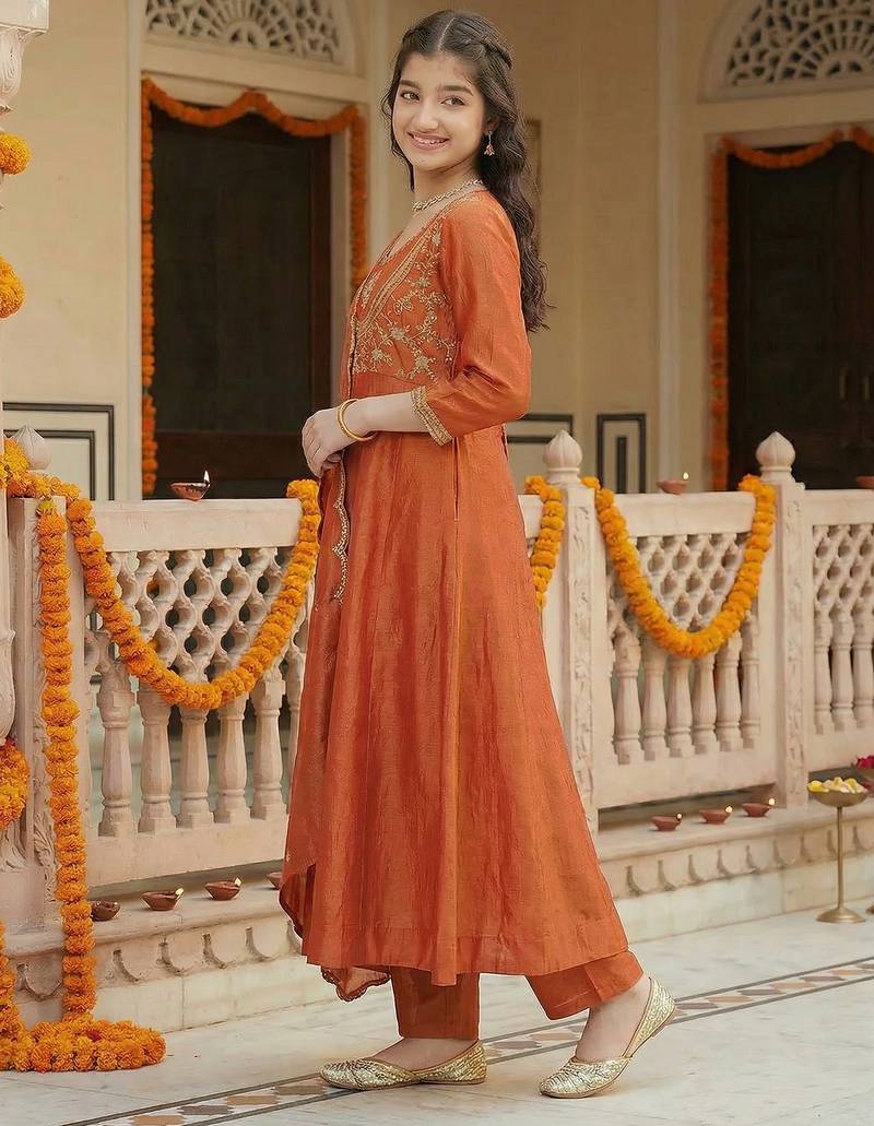 | Product Description | Elegant Girl’s Kurta Pant With Dupatta Set Crafted In Rich Vichitra Silk, Offering A Smooth Texture And Graceful Drape With A Luxurious Appeal. The Kurta Features Delicate Embroidered Butti Work With Intricately Detailed Neckline And Hem Embroidery, Creating A Refined Traditional Pattern. Paired With Comfortable Crepe Fabric Pants That Provide A Sleek And Flattering Silhouette For All Day Wear. The Look Is Completed With A Beautifully Textured Dupatta. |