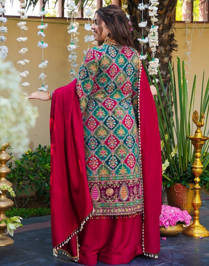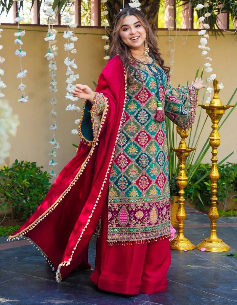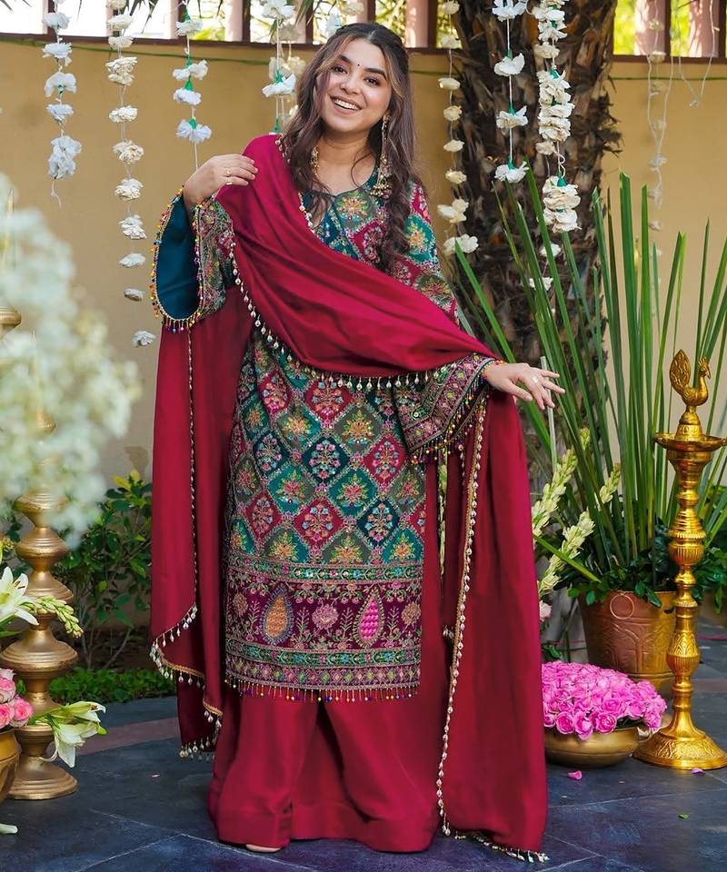 | Product Description | This Beautifully Designed Kurta Palazzo Set Crafted From Premium French Crepe Silk Fabric, Offering A Smooth Texture With A Rich And Flowy Drape. The Kurta Features Intricate Multicolor Ethnic Prints With Detailed Border Work And Stylish Sleeve Accents, Adding A Vibrant And Festive Charm. Paired With Comfortable Palazzo Pants And A Contrasting Dupatta With Delicate Edging, It Creates A Graceful And Eye Catching Look. Perfect For Festive Occasions, Parties, And Traditional Gatherings, This Outfit Blends Modern Style With Classic Appeal. Kurta Palazzo Set, Kurta Set, Designer Kurta Set, Trendy Kurta Set, Latest Design Kurta, Silk Fabric Kurta Set, Cotton Kurta Set, Suit Set, Ethnic Wear Women, Traditional Wear, Party Wear Kurta Set, Festive Wear Kurta Palazzo, Printed Kurta Set, Embroidered Kurta Set, Stylish Kurta Palazzo, Fashionable Ethnic Set, Daily Wear Kurta Set, Occasion Wear Suit Set, Women Kurta Palazzo Set, Elegant Kurta Set, Modern Ethnic Wear, Fancy Kurta Set, New Arrival Kurta Set, Indian Wear For Women, Casual Kurta Set, Premium Kurta Palazzo Outfit. |