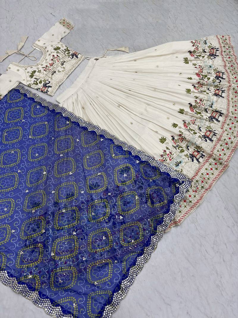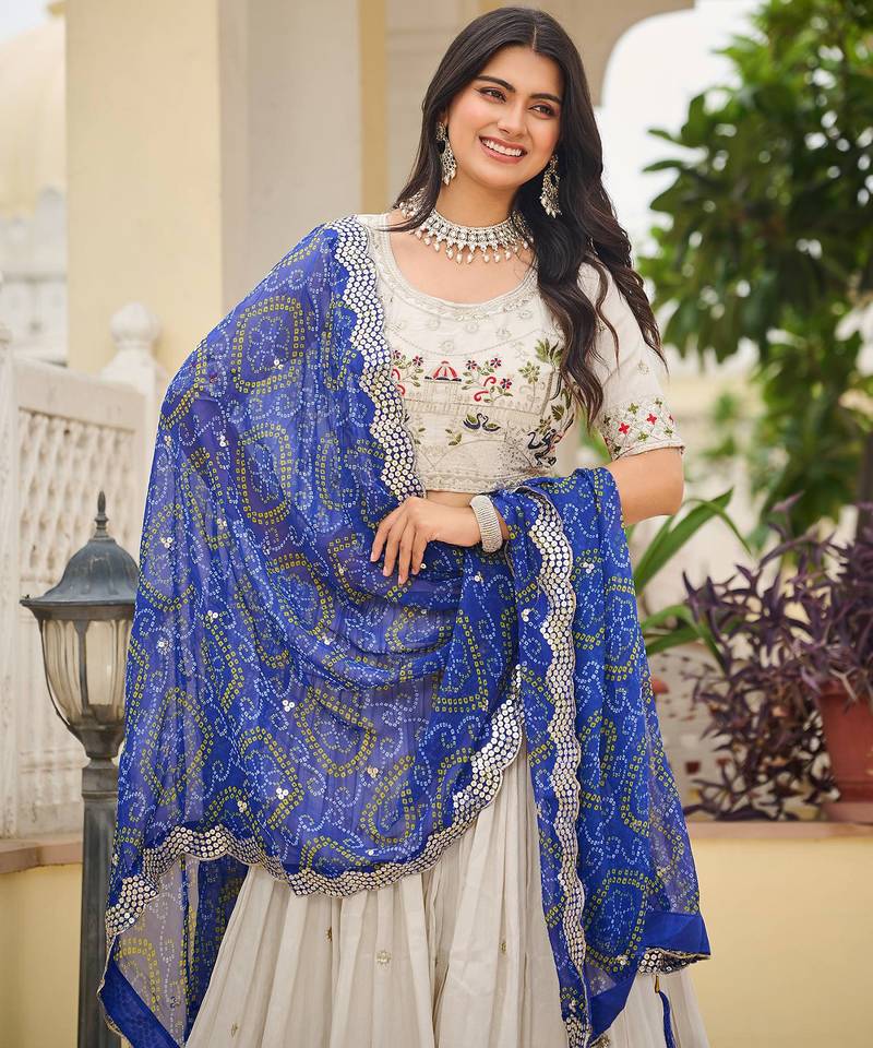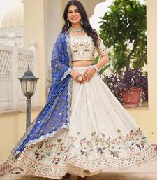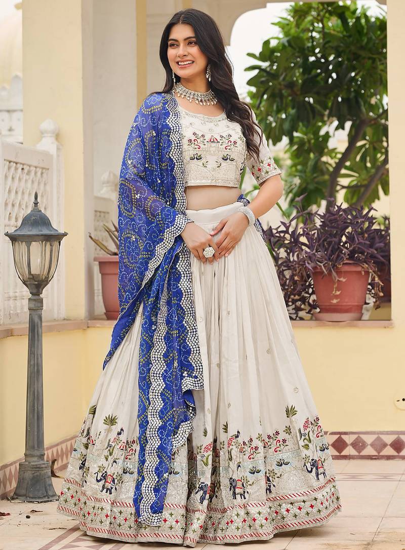 | Product Description | Elevate Your Festive Look With This Stunning Lehenga Choli With Dupatta Set Crafted In Rich Chinnon Silk For A Graceful, Flowy Silhouette. The Lehenga Showcases Eye Catching Traditional Embroidery With A Statement Border, While The Unstitched Blouse Allows A Perfect Custom Fit. Finished With A Lightweight Georgette Dupatta Featuring Bold Patterns And Embellished Edges, This Semi Stitched Ensemble Delivers A Luxurious, Wedding Ready Appeal That Truly Stands Out. Embroidered Lehenga Choli, Mirror Work Lehenga, Zari Work Lehenga, Off White Lehenga, Bridal Lehenga, Wedding Wear Lehenga, Party Wear Lehenga, Designer Lehenga Set, Heavy Embroidery Lehenga, Traditional Lehenga, Festive Lehenga Choli, Peacock Design Lehenga, Flared Lehenga, Dupatta Lehenga Set |
