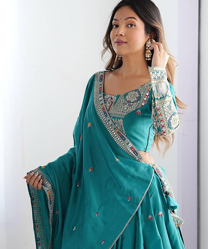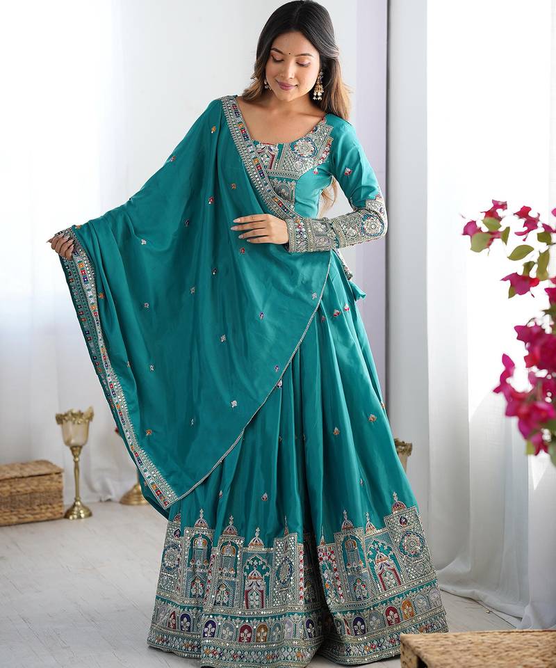 | Product Description | Elevate Your Festive Look With This Regal Lehenga Set, Crafted In Luxurious Chinnon Fabric. The Blouse Features Intricate Multi Color Thread Embroidery With Mirror Work, Inspired By Traditional Heritage Motifs, Extending Gracefully To The Sleeves. The Lehenga Is Richly Adorned With Heavy Embroidered Borders Depicting Royal Patterns, Adding Grandeur To The Outfit. Tiny Buti Work Across The Body Enhances Its Charm, While The Dupatta Carries A Delicate Embroidered Border For A Refined Finish. Perfect For Weddings, Sangeet, Or Festive Occasions, This Ensemble Beautifully Blends Tradition With Contemporary Elegance. |