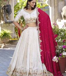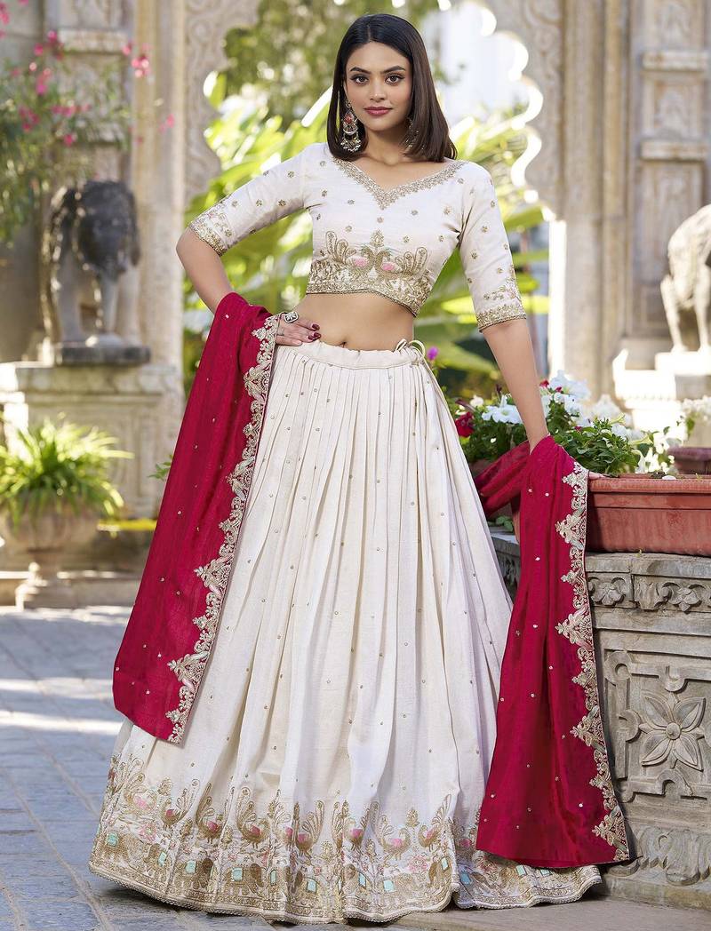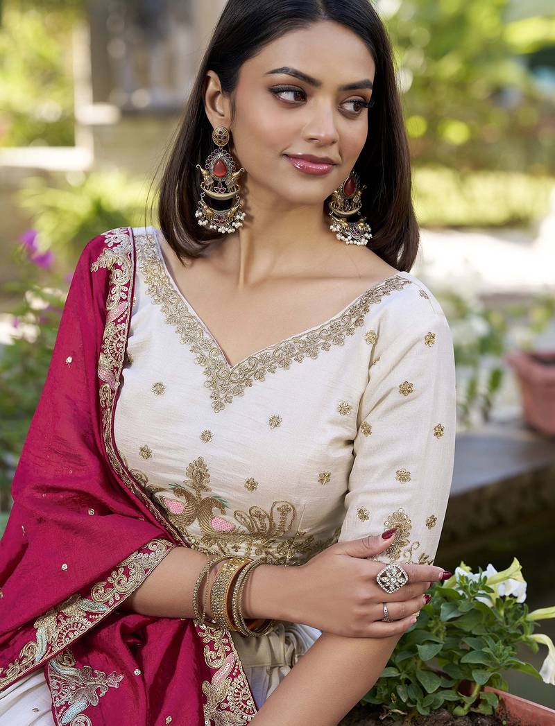 | Product Description | Radiate Elegance With This Stunning Lehenga Set Crafted From Pure Chinnon Fabric, Known For Its Soft Texture And Graceful Fall. The Off White Lehenga And Blouse Feature Delicate Zari, Mirror, And Thread Embroidery With Intricate Floral And Peacock Motifs Along The Hem And Neckline. The Contrasting Pink Dupatta With Scattered Sequins And Embroidered Border Adds A Regal Touch. The Flared Silhouette And V Neck Blouse Make It A Perfect Choice For Weddings, Receptions, Or Festive Occasions. This Designer Ensemble Blends Classic Craftsmanship With Contemporary Flair.Chinnon Lehenga, Embroidered Lehenga Choli, Mirror Work Lehenga, Zari Work Lehenga, Off White Lehenga, Bridal Lehenga, Wedding Wear Lehenga, Party Wear Lehenga, Designer Lehenga Set, Heavy Embroidery Lehenga, Traditional Lehenga, Festive Lehenga Choli, Peacock Design Lehenga, Flared Lehenga, Dupatta Lehenga Se |