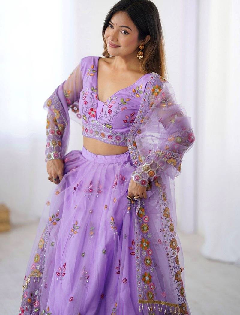 Womens's net floral embroidered semi-stitched lehenga choli with dupatta set