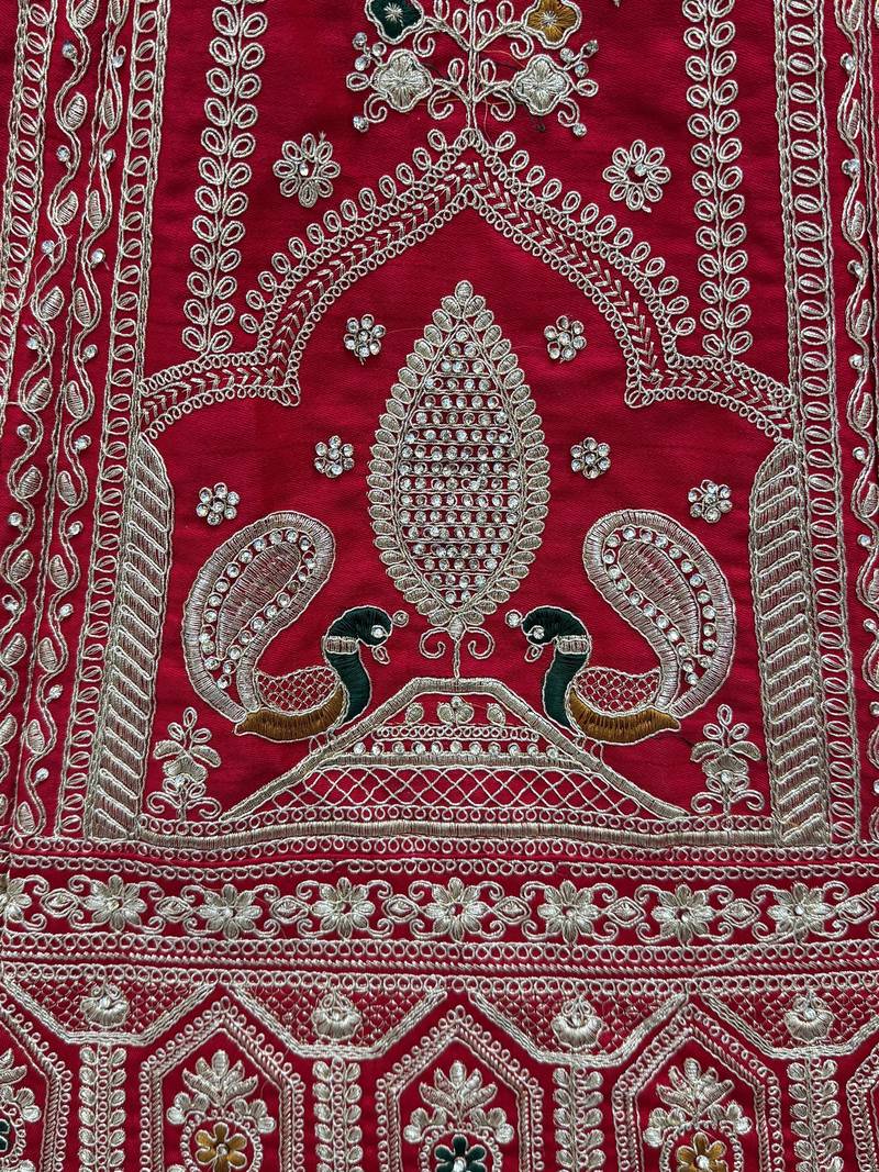 The Lehenga Is Crafted From Royal Red Silk Fabric With Detailed Dori Embroidery And Peacock Figure Motifs, Enhanced With Multi Thread Work, Zari, And Diamond Embellishments In Elegant Gold Tones.