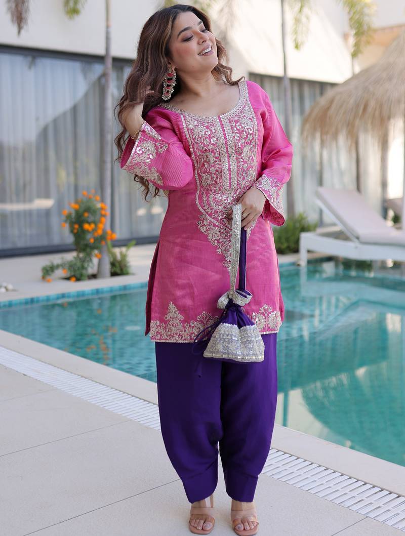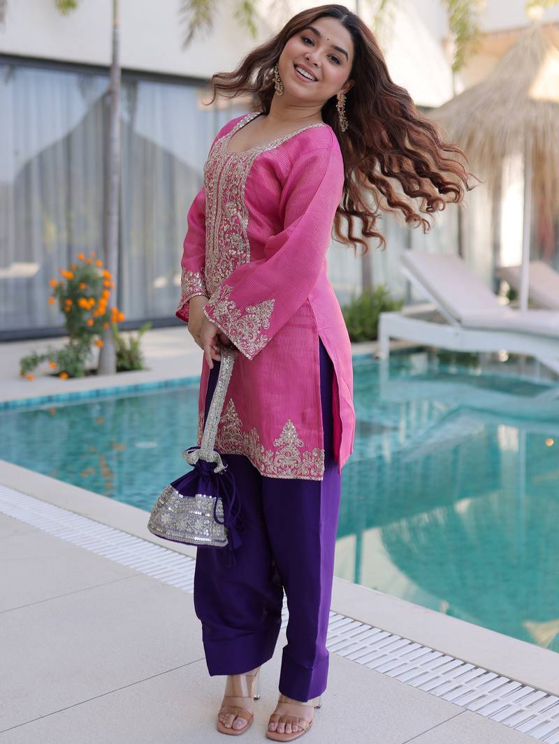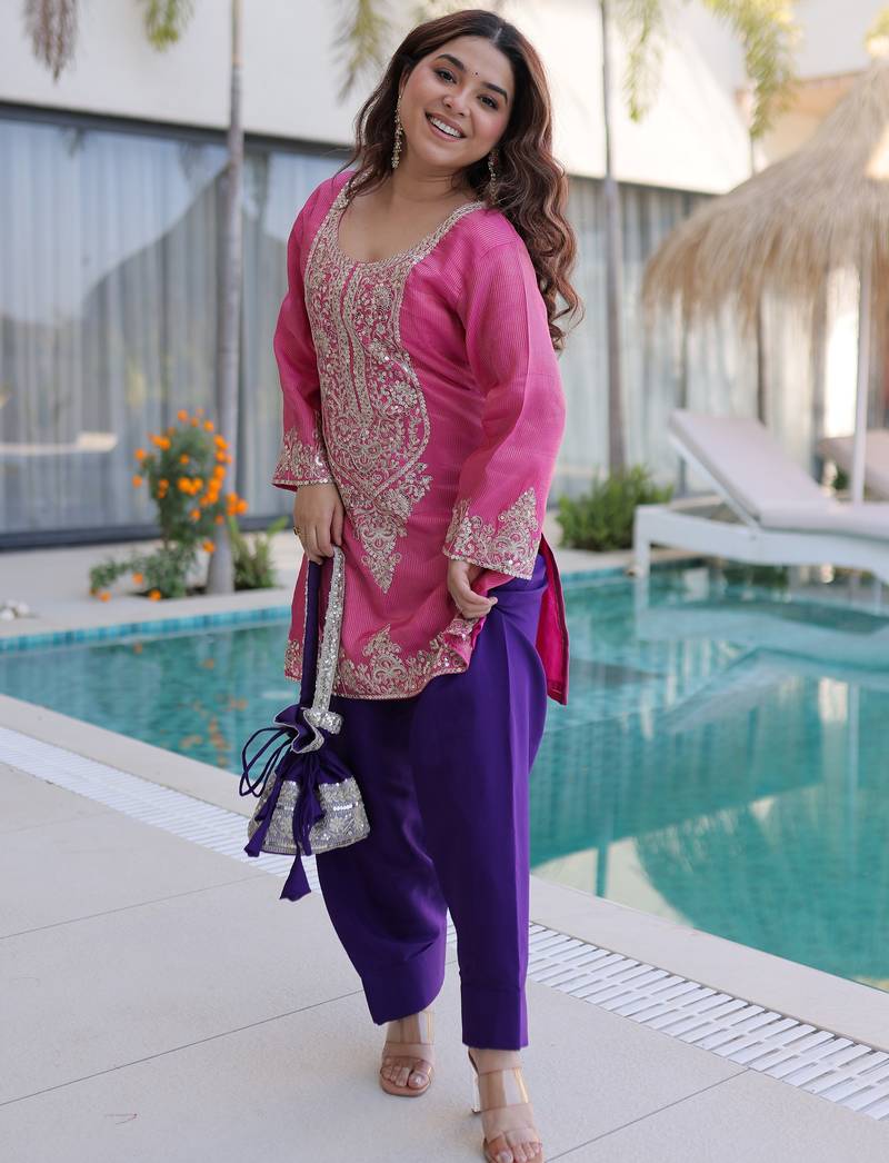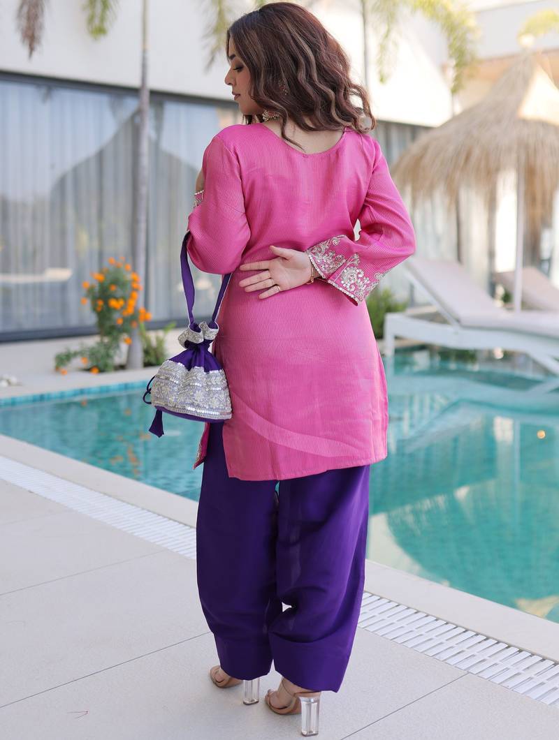 Overall, The Blend Of Pink With Royal Purple And Gold Accents Creates A Lively And Eye Catching Outfit, Perfect For Festive Celebrations, Small Functions, And Traditional Gatherings.
