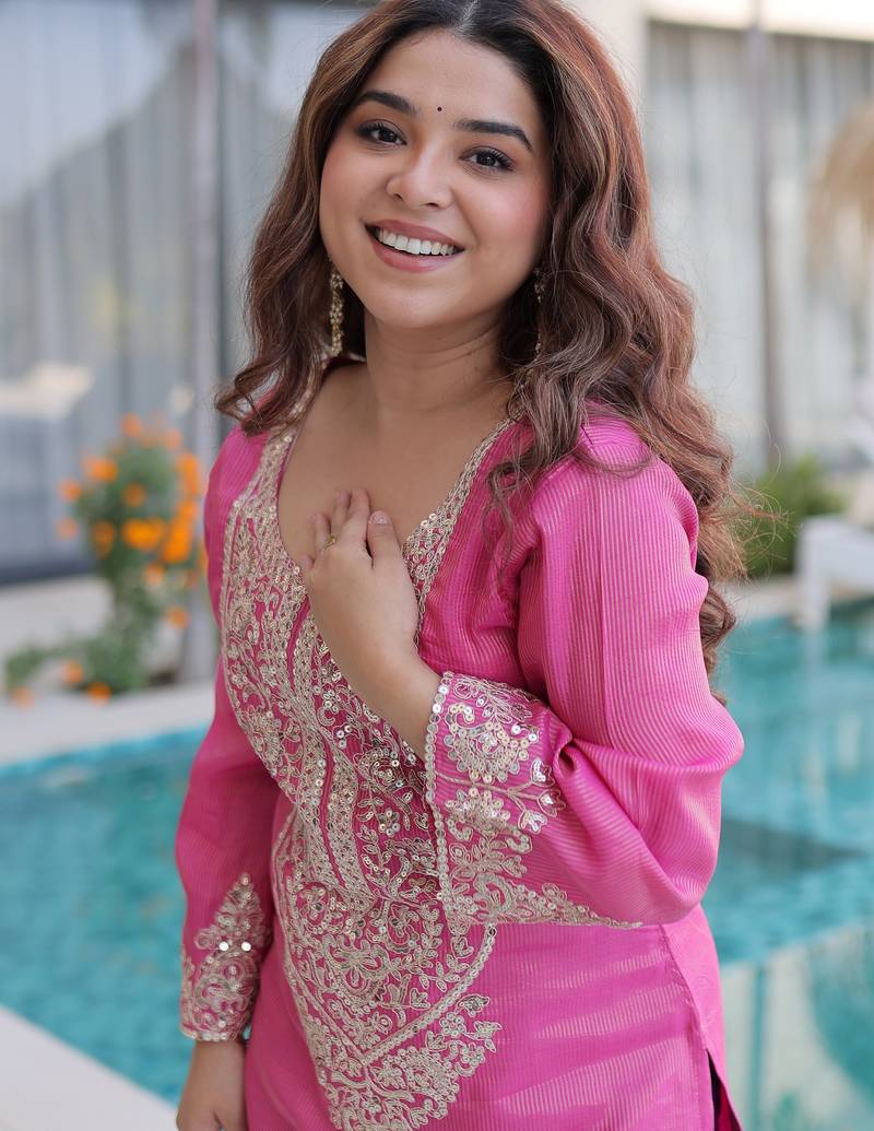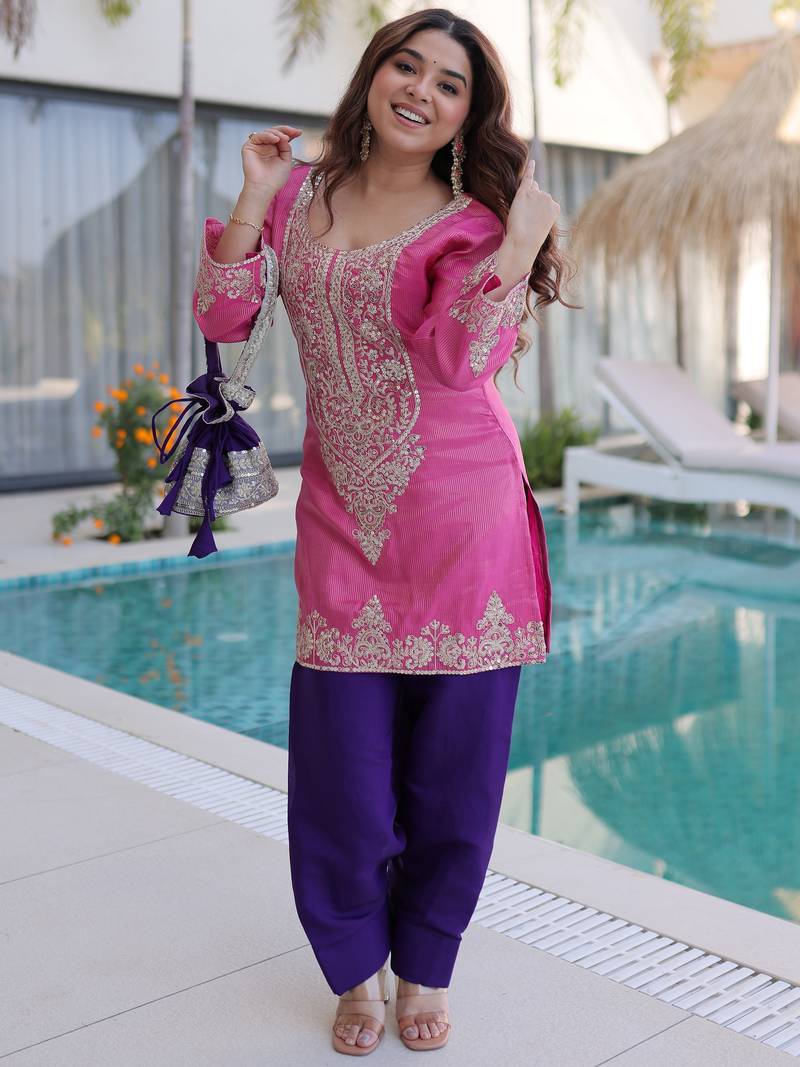 Alluring pink zari work viscose traditional salwar kameez stitched