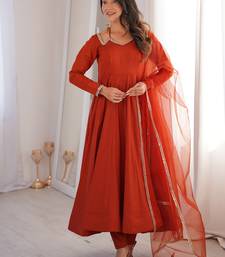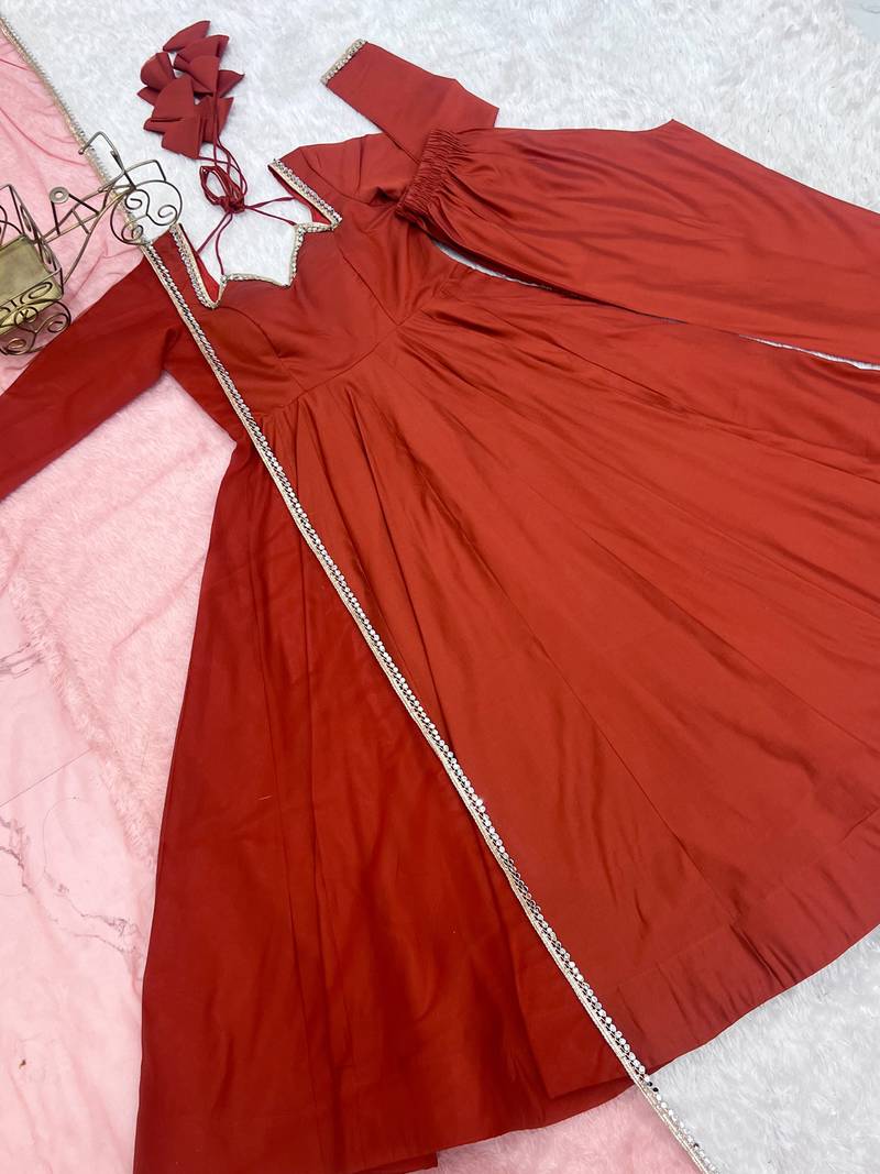Alluring rust orange lace work roman silk festive wear anarkali pant suit stitched