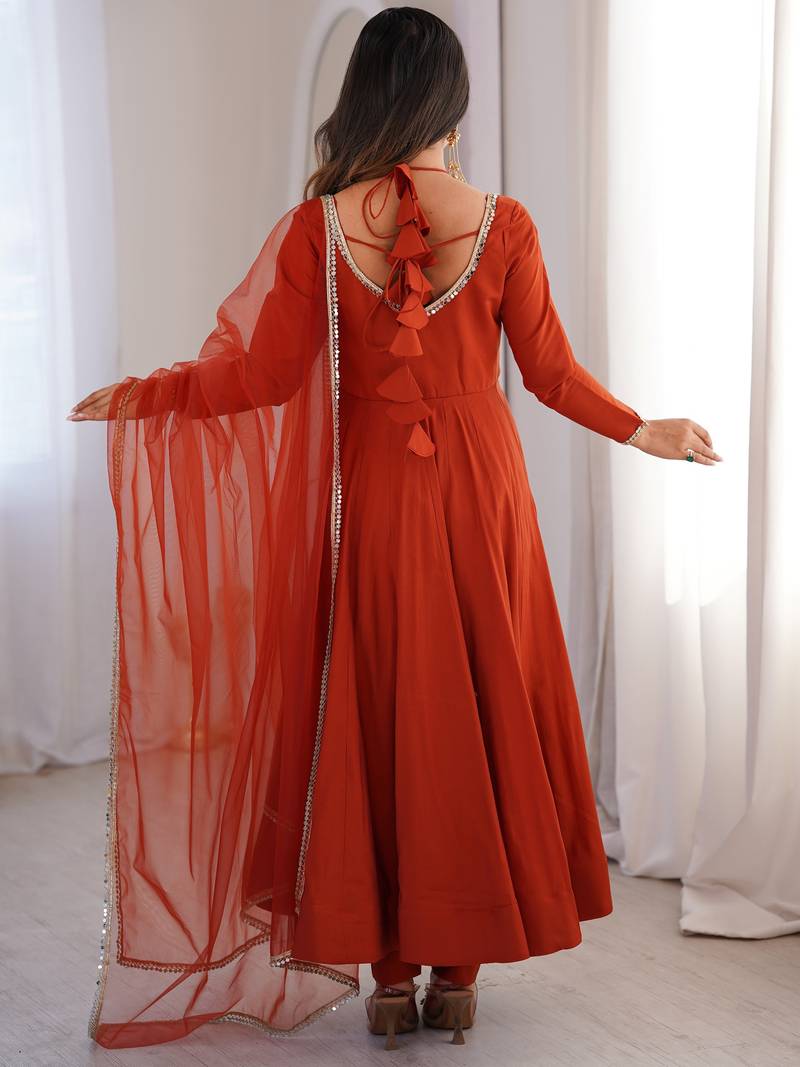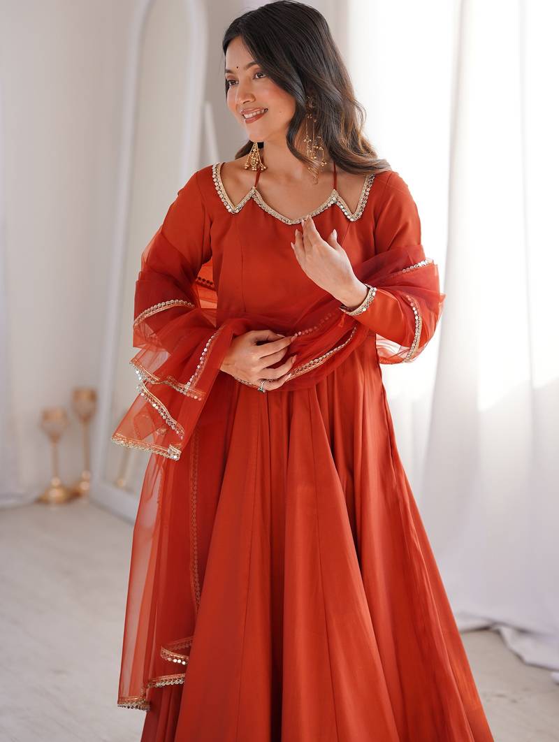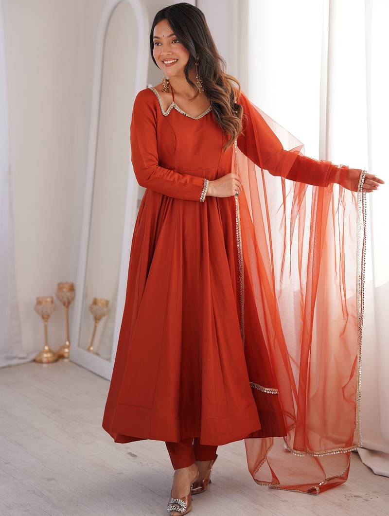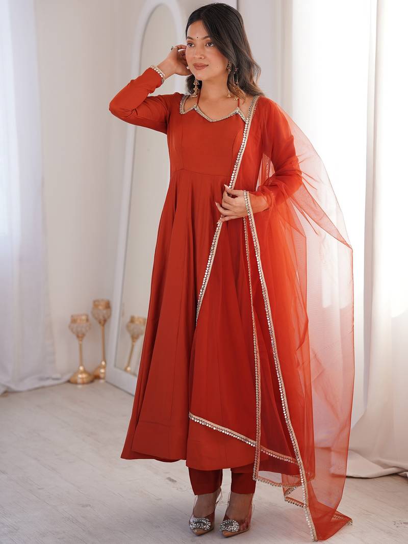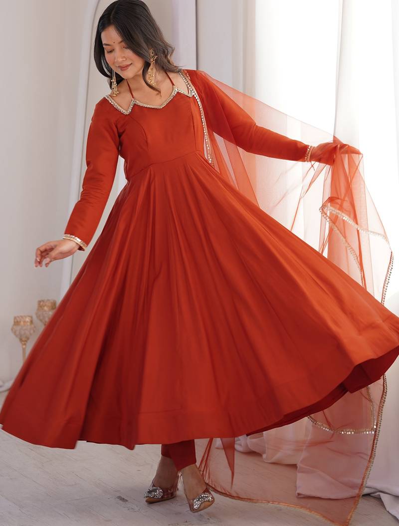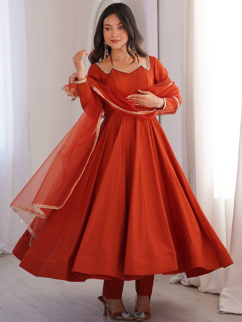 Featuring A Rich Burnt Orange Anarkali Set, The Outfit Highlights A Warm Rusty Orange Shade With Subtle Gold Lace Detailing That Enhances The Elegant Look.