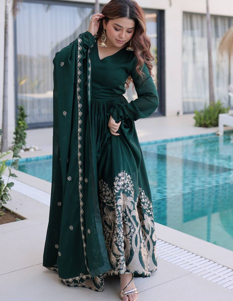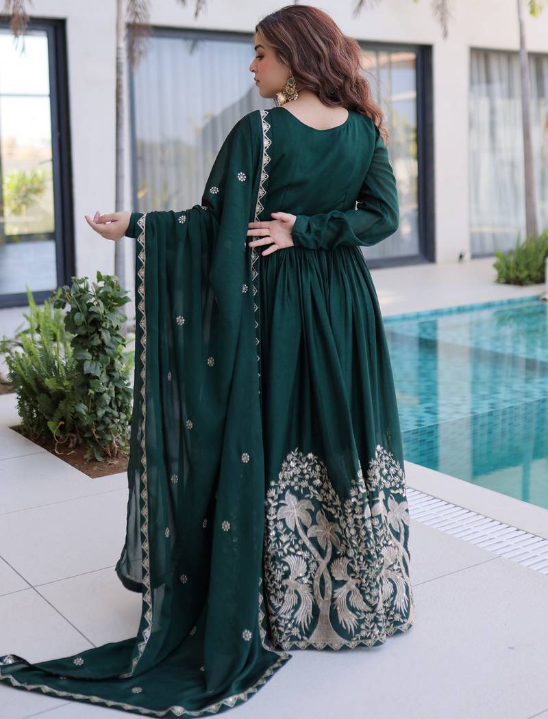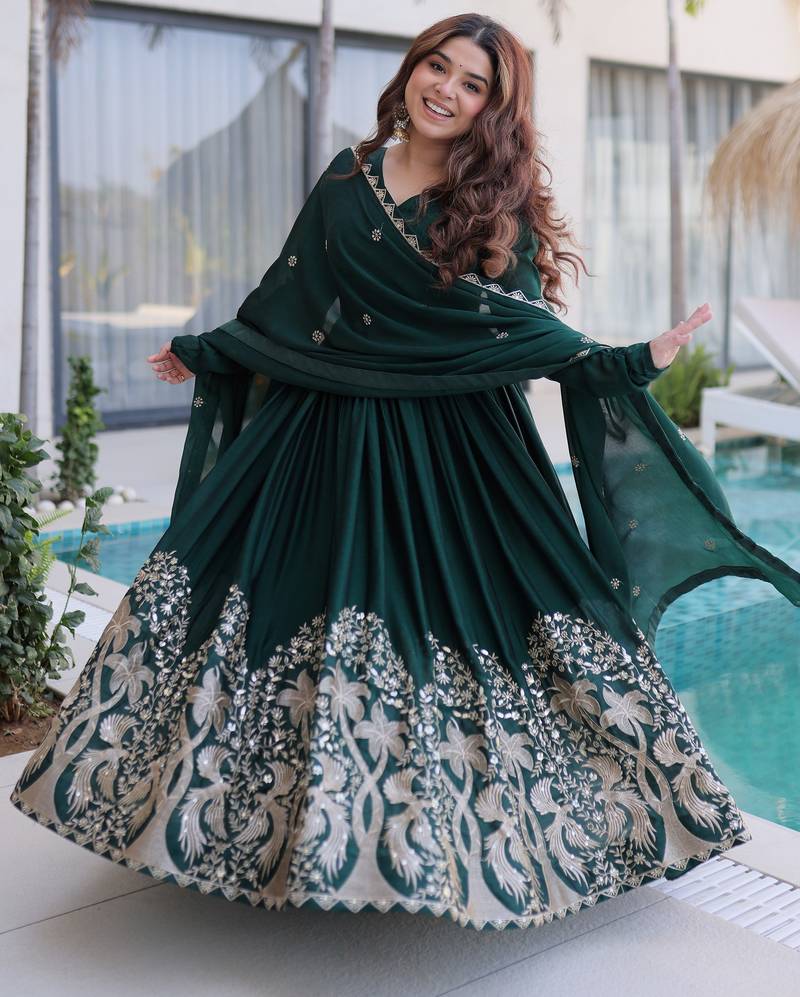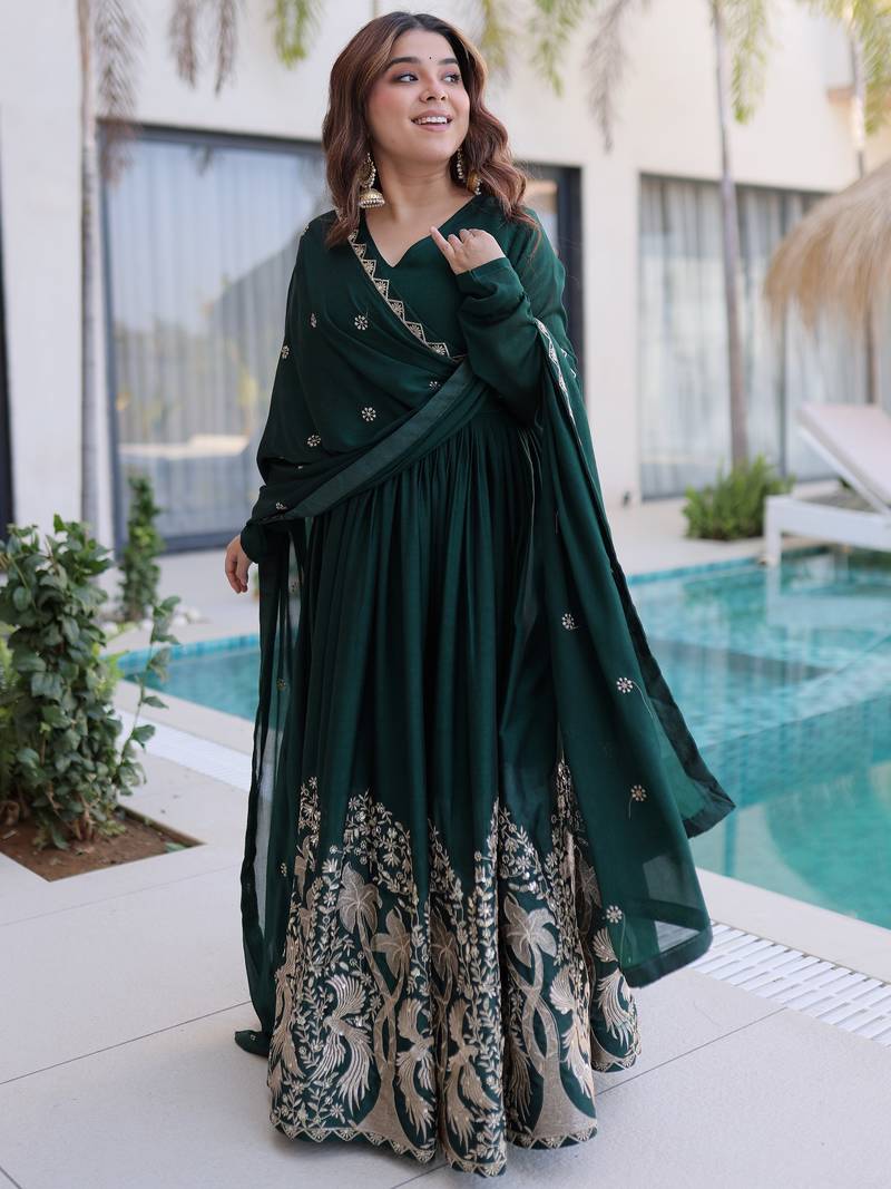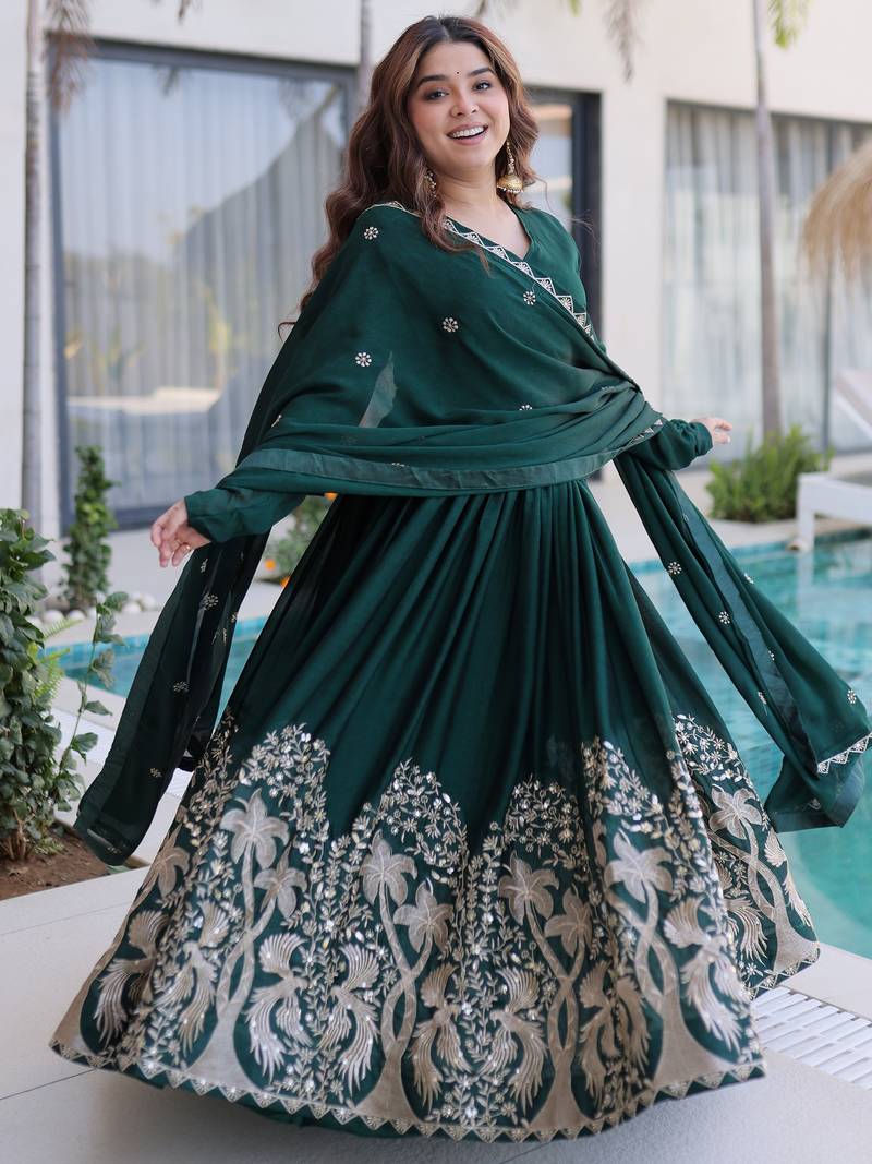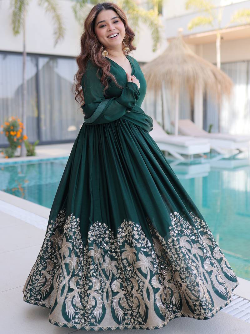 The Gown Comes In A Rich Deep Emerald Green Shade, Giving It A Bold And Elegant Appeal. Crafted In Rangoli Crush Fabric With Sequins Multi Embroidery, It Features A 3 Meter Flair And 55 Inch Length, Available In M (38”), L (40”), Xl (42”), And Xxl (44”) Sizes.