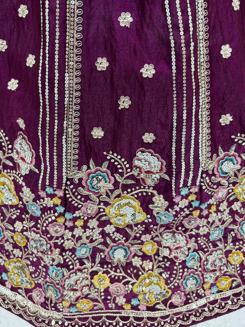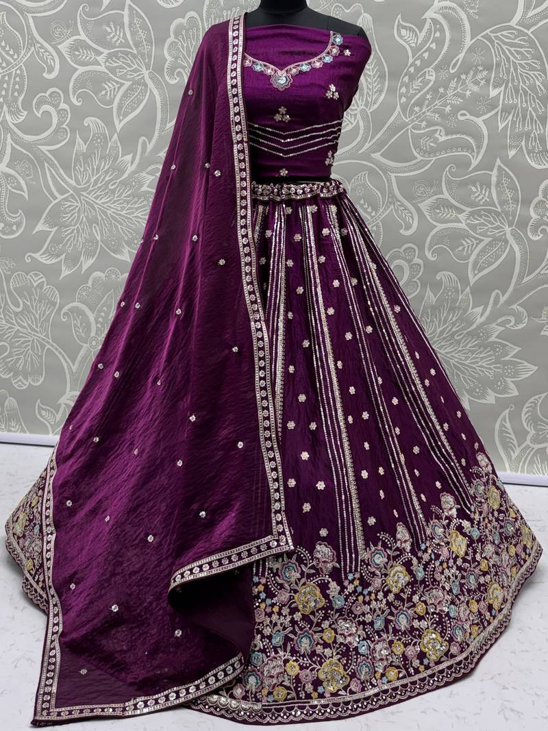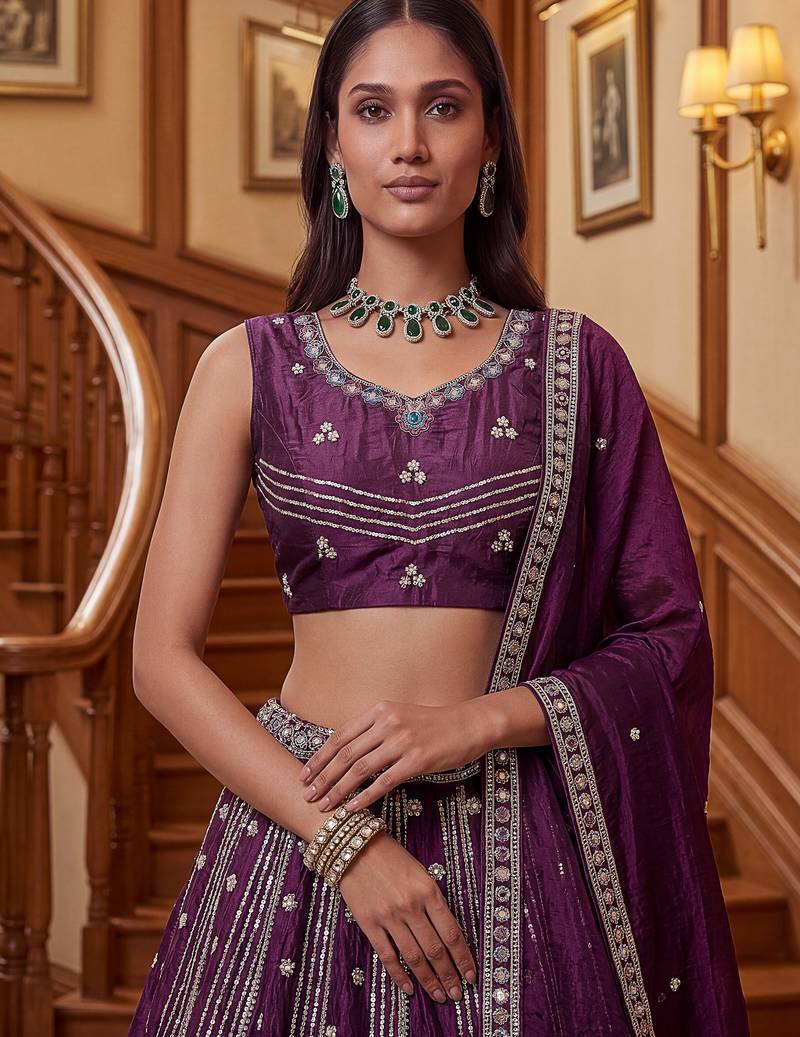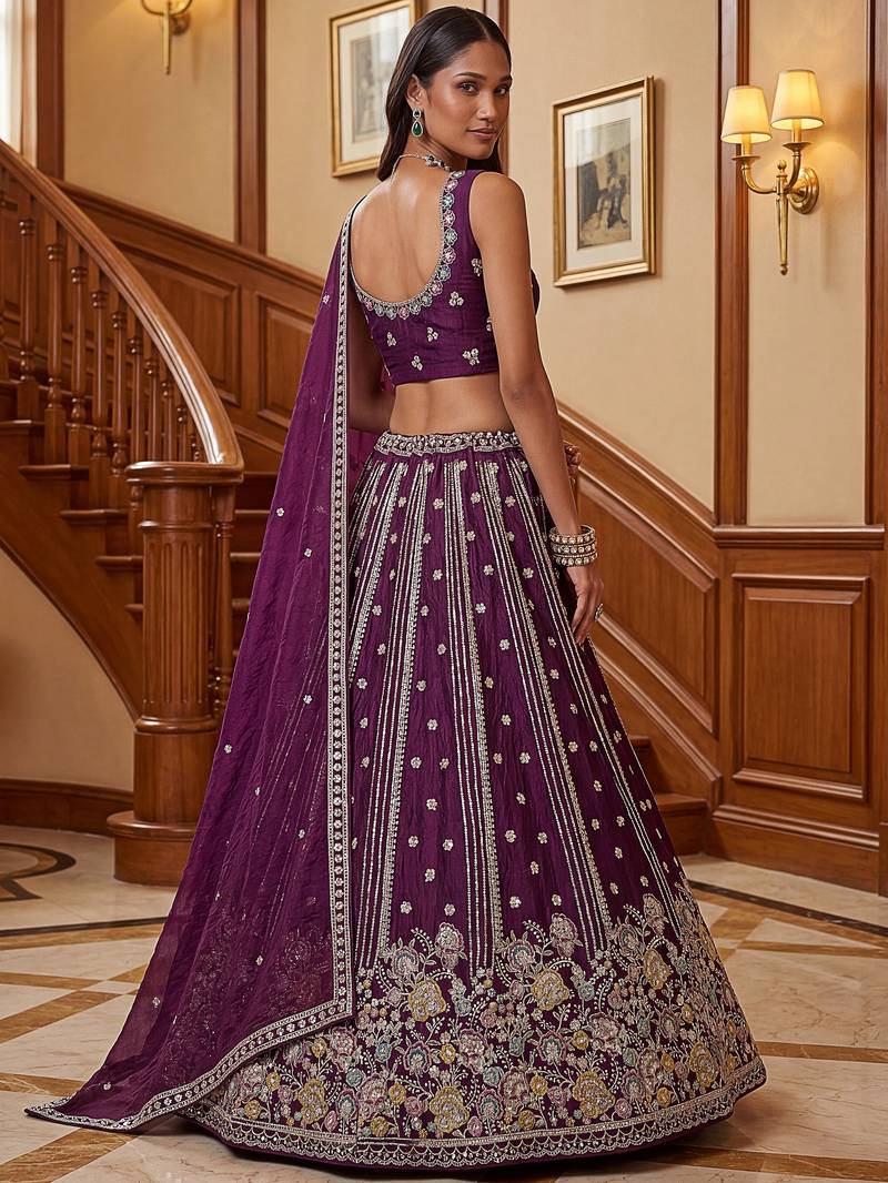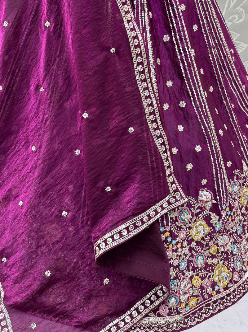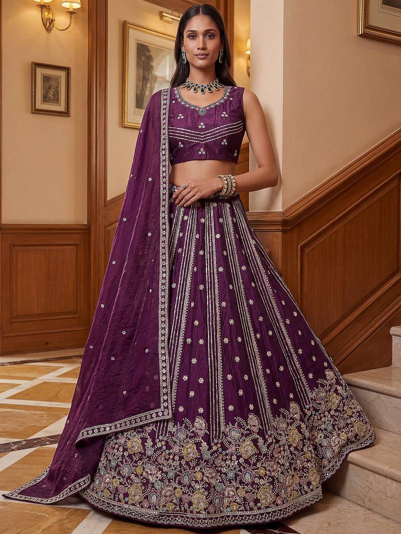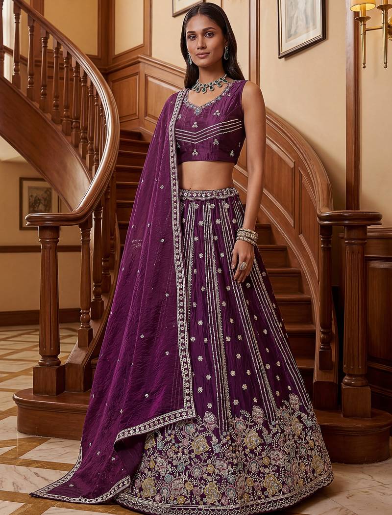 | Product Description | This Lehenga Is Crafted In A Rich Deep Wine Purple Organza Fabric Adorned With Intricate Dori Embroidery, Multi Thread Floral Work, Zari Detailing, And Sequin Embellishments, Creating A Luxurious And Eye Catching Finish.