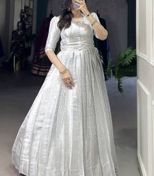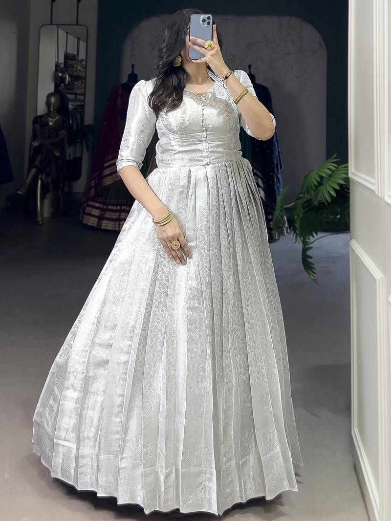Awesome Off White Zari Weaving Silk Festive Wear Gown With Koti
