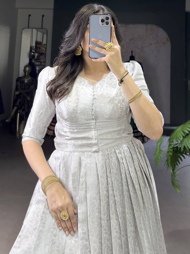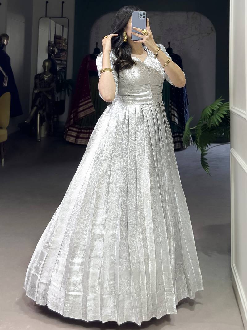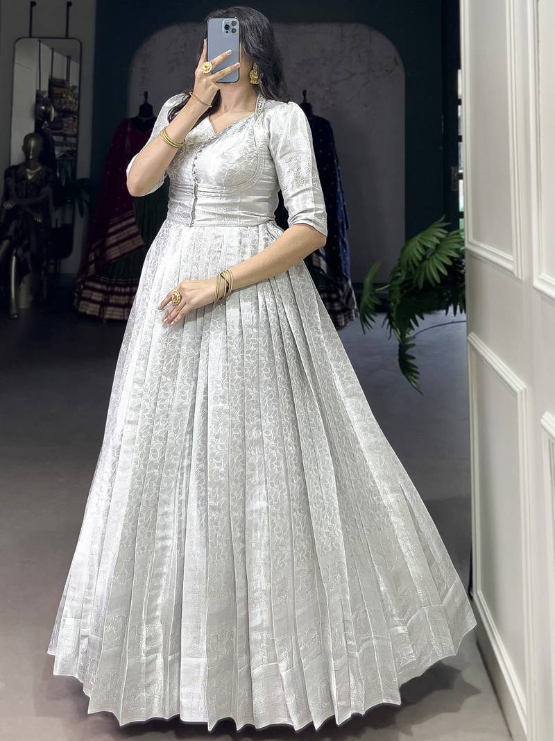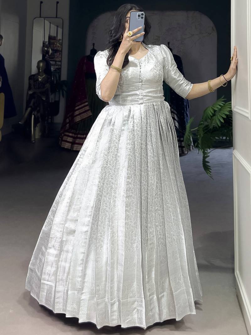 The Gown Is Designed In A Soft Off White Kanjivaram Fabric With Elegant Silver Zari Weaving And Lace Touch Up, Giving It A Rich Yet Graceful Look. It Comes In M Size With A Chest Size Of 42 Inches, Including A 2 Inch Margin For Adjustment From 38 To 42 Inches.
