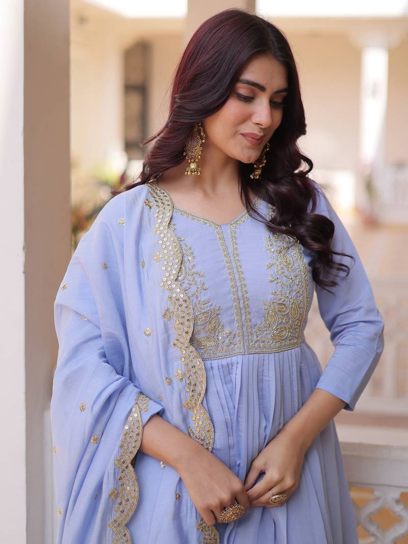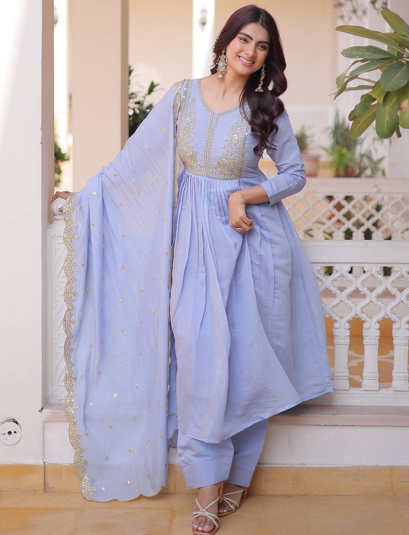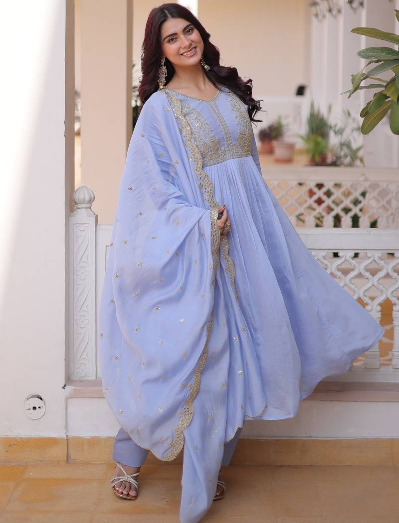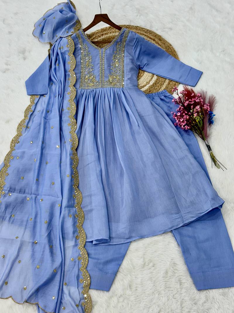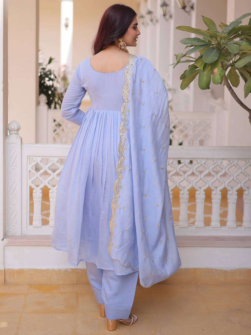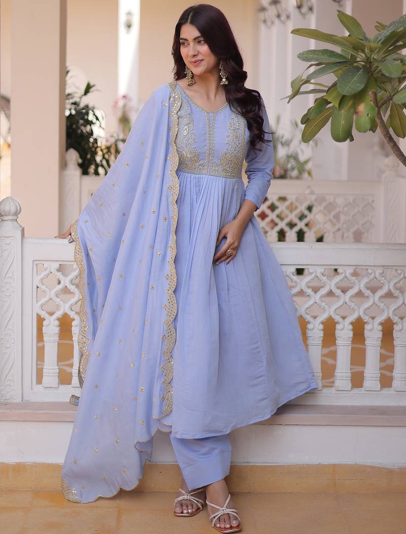 Awesome sky blue bead embroidered chanderi event wear salwar kameez stitched