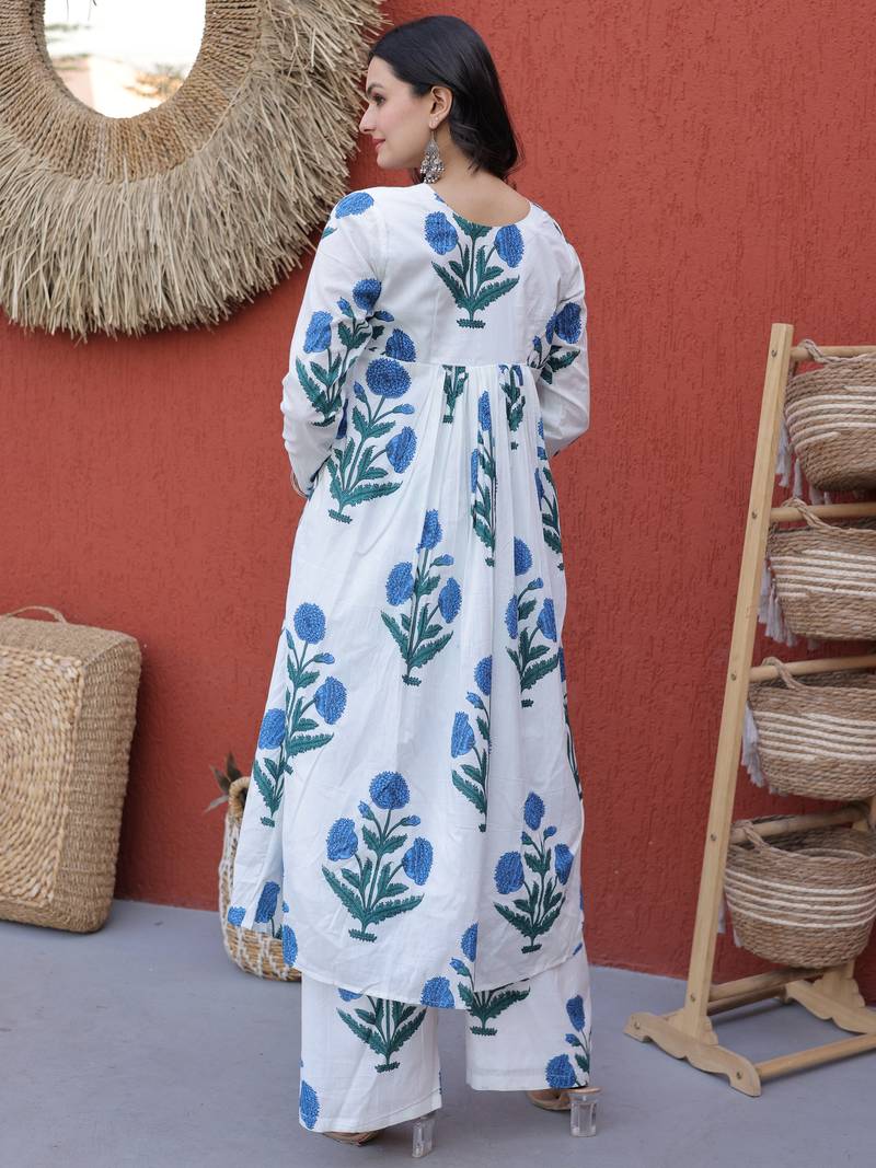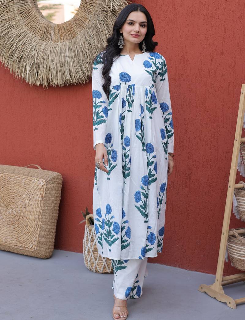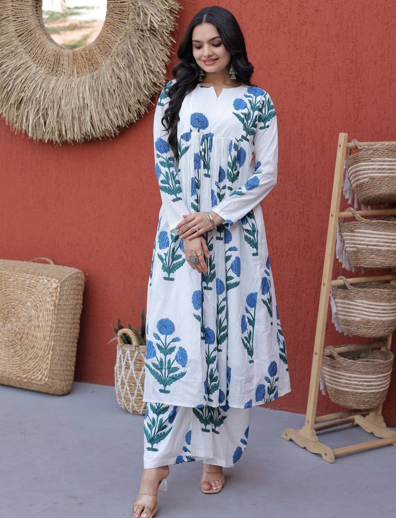| Product Description | This Outfit Features A Soft White Base Tone, Beautifully Enhanced With Elegant Sky Blue Floral Prints And Subtle Leafy Green Accents, Creating A Fresh And Soothing Color Combination.