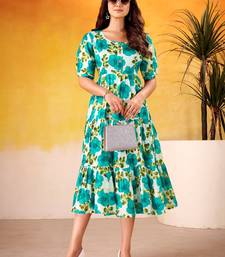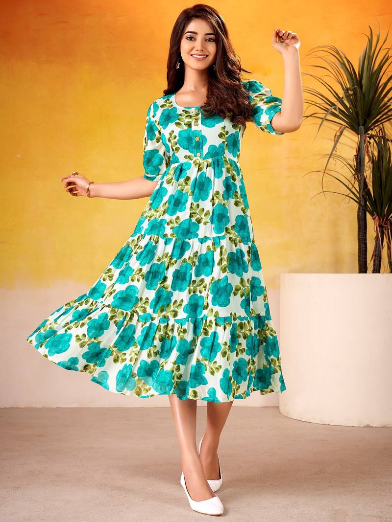 Beautiful teal green flower printed silk summer wear dress stitched