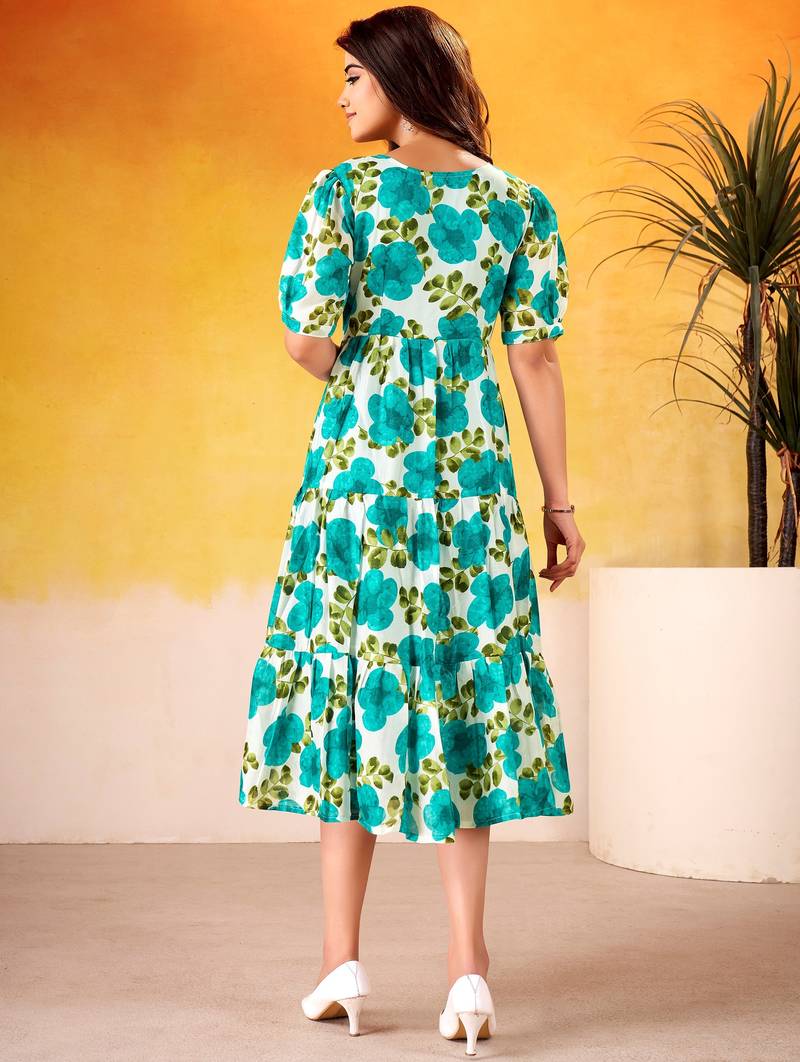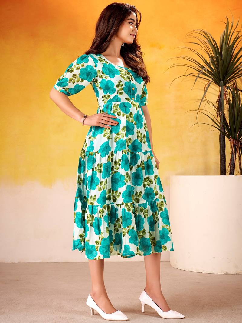 Beautiful Teal Green Flower Printed Silk Summer Wear Dress