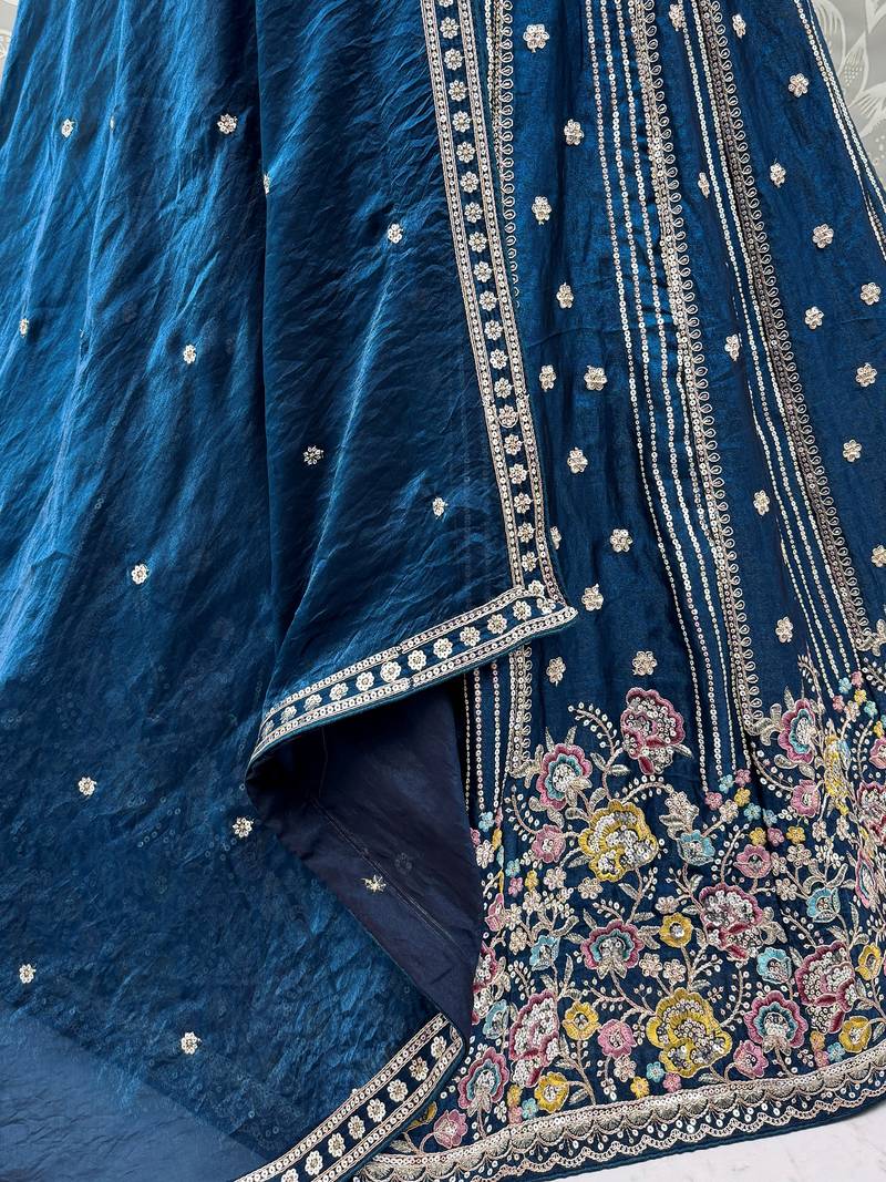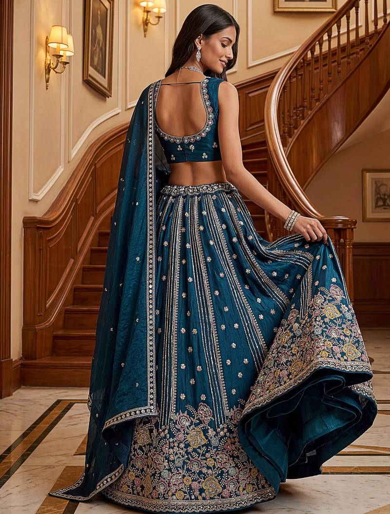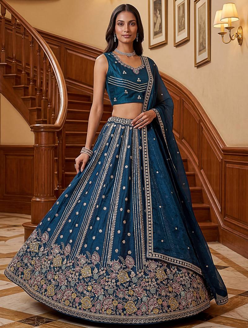 | Product Description | This Lehenga Is Designed In A Rich Deep Teal Blue Organza Fabric Highlighted With Intricate Dori Embroidery, Multi Thread Floral Detailing, Zari Work, And Sequin Embellishments, Creating A Graceful And Vibrant Look.