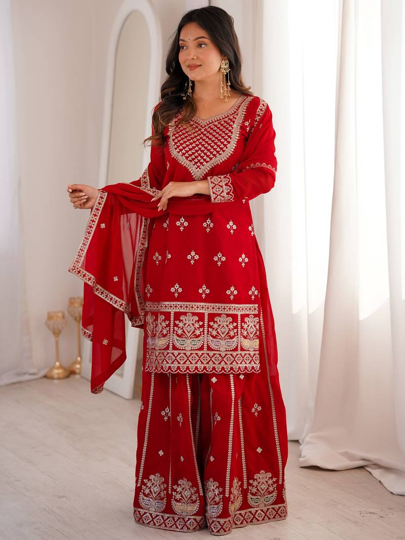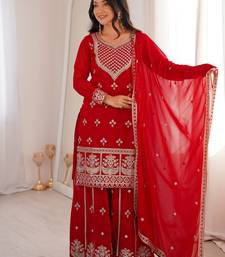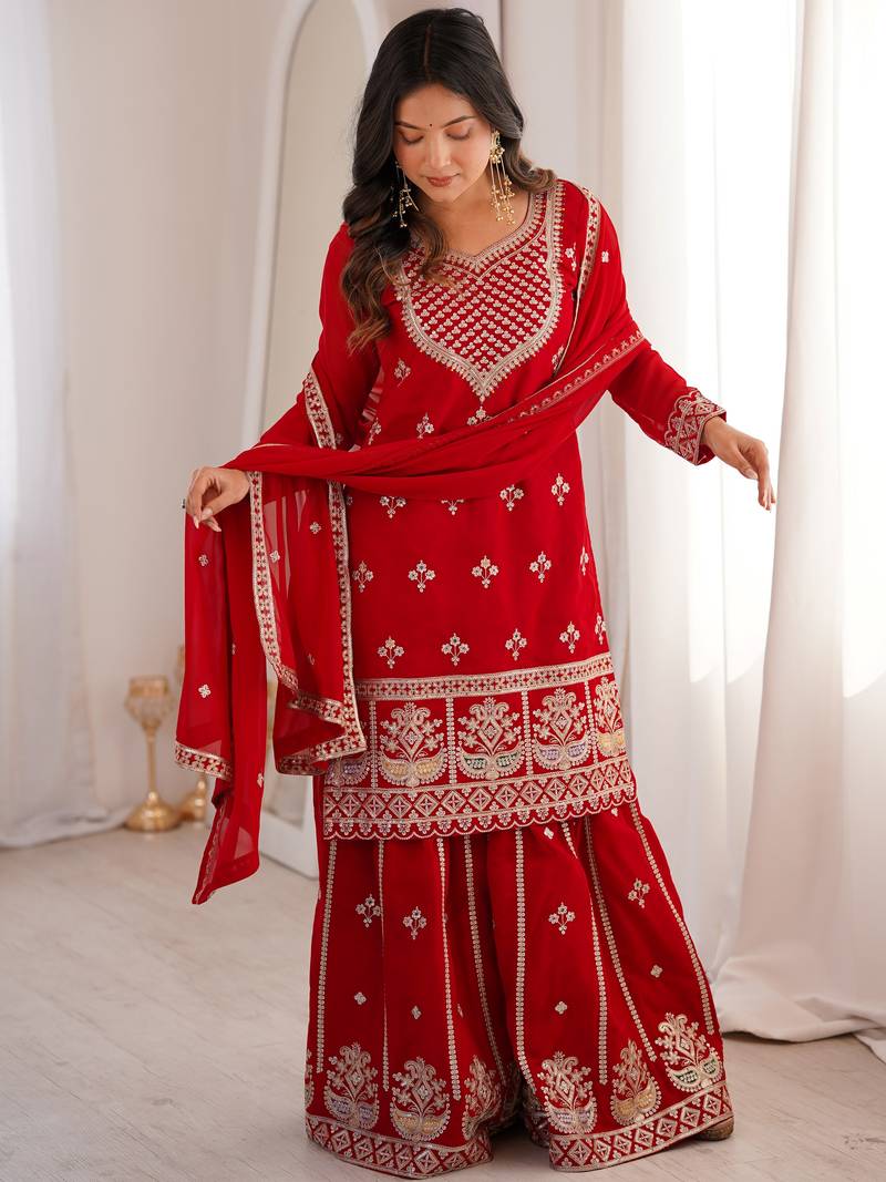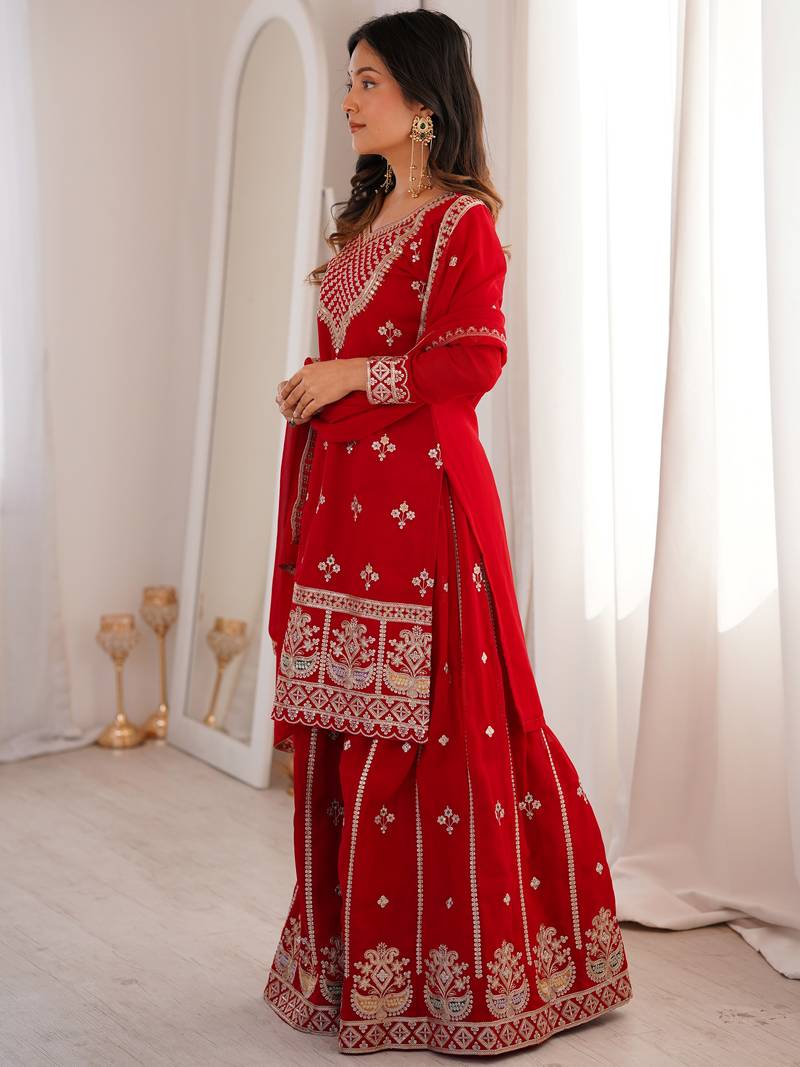 Dreamy red dori embroidered georgette engagement wear sharara suit stitched