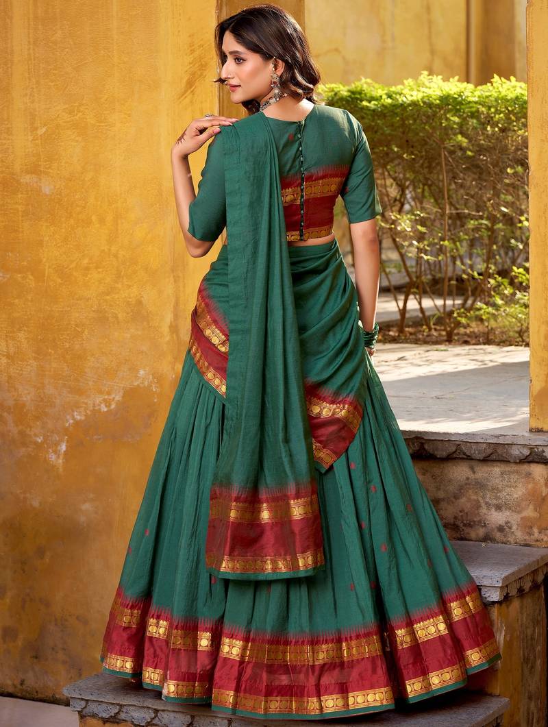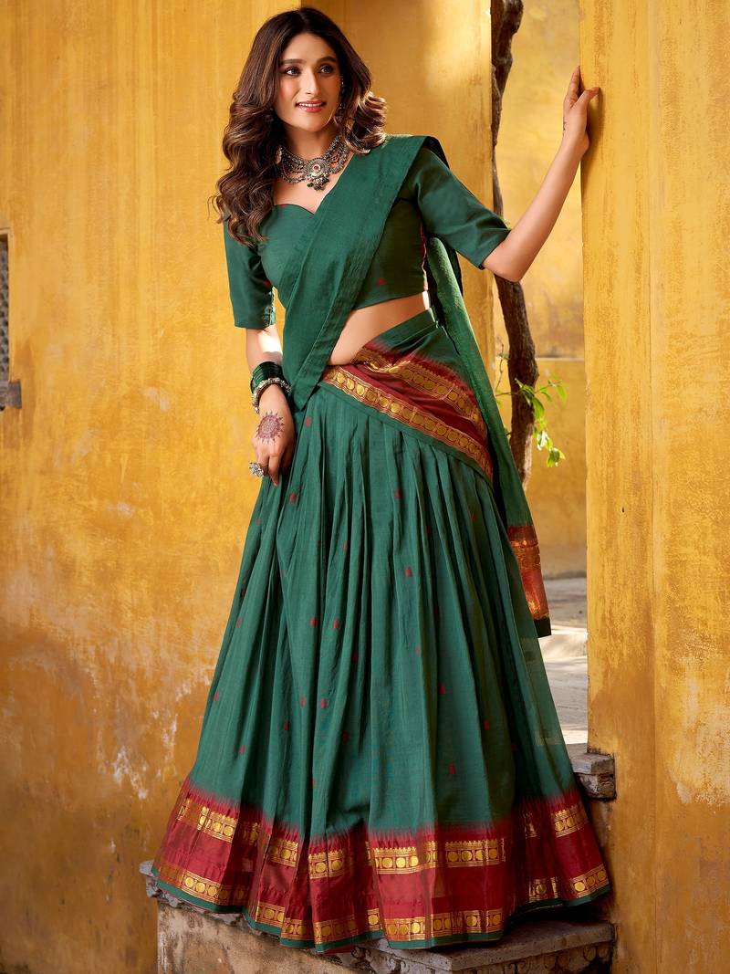 | Product Name | Fabulous Teal Green Zari Weaving Chanderi Mehendi Wear Half Saree Lehenga | |