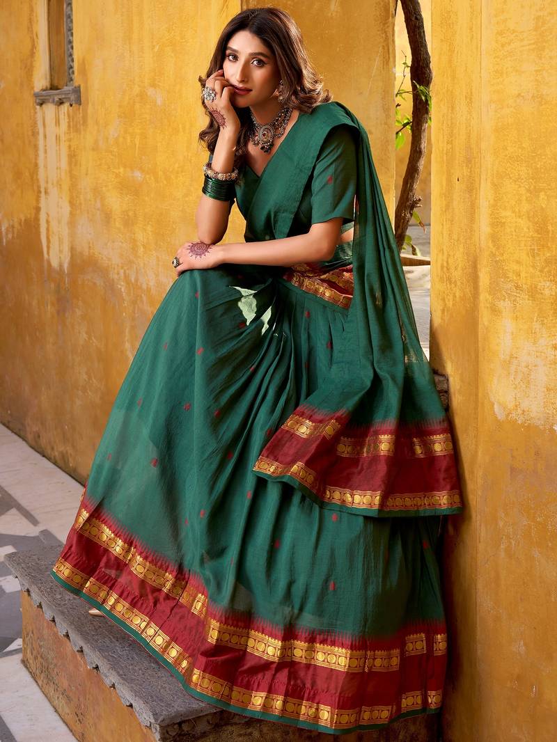 | Product Description | The Lehenga Is Designed In A Rich Deep Bottle Green Shade, Highlighted With A Contrasting Maroon Border And Gold Zari Weaving, Creating A Bold And Traditional Look. With A 4 Meter Flair And 41 Inch Length, It Supports Waist Sizes Up To 42 Inches, Offering A Graceful And Flowy Silhouette.