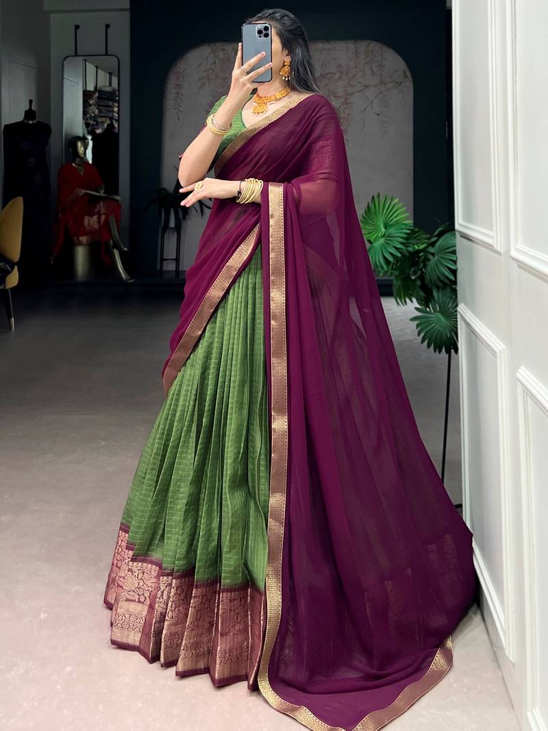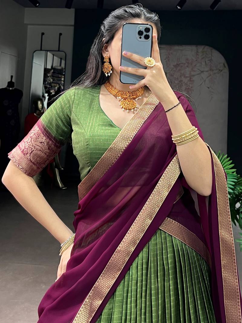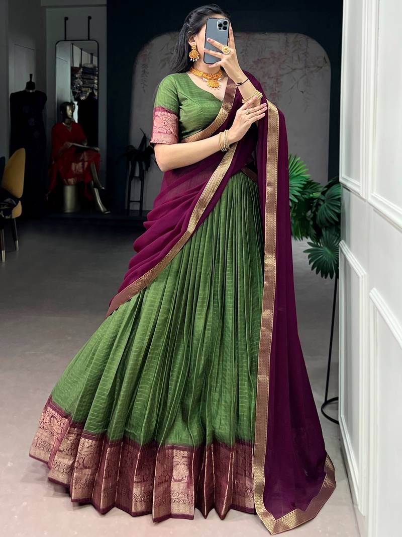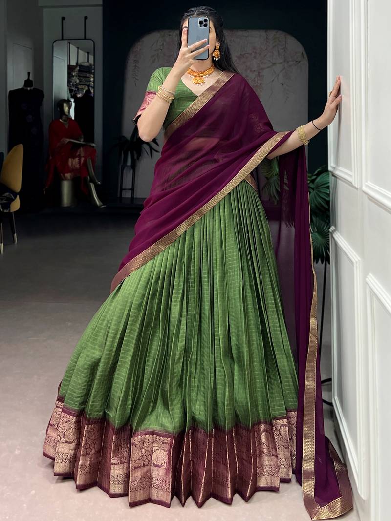 Glorious mehendi green zari weaving silk lehenga choli with dupatta