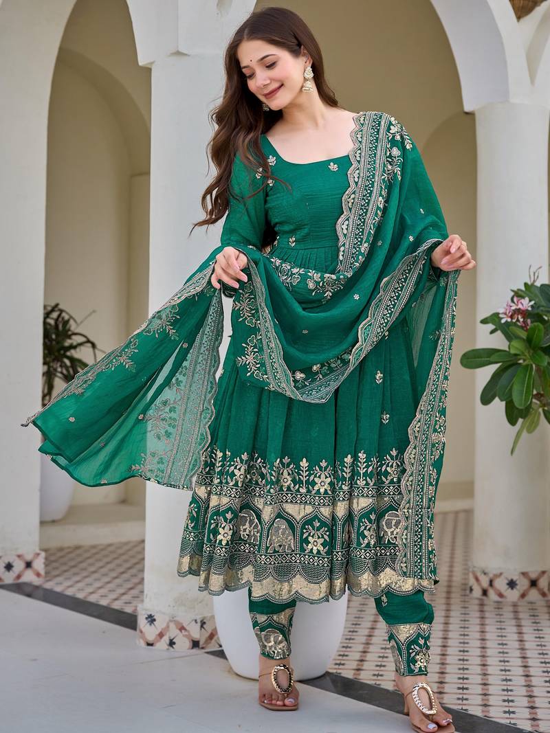 Gorgeous Green Sequins Silk Mehendi Wear Anarkali Pant Suit