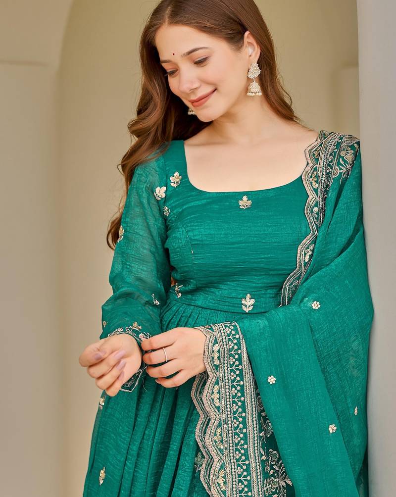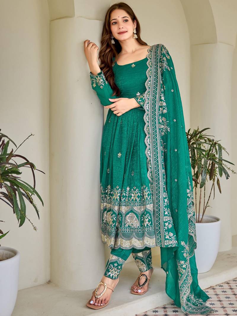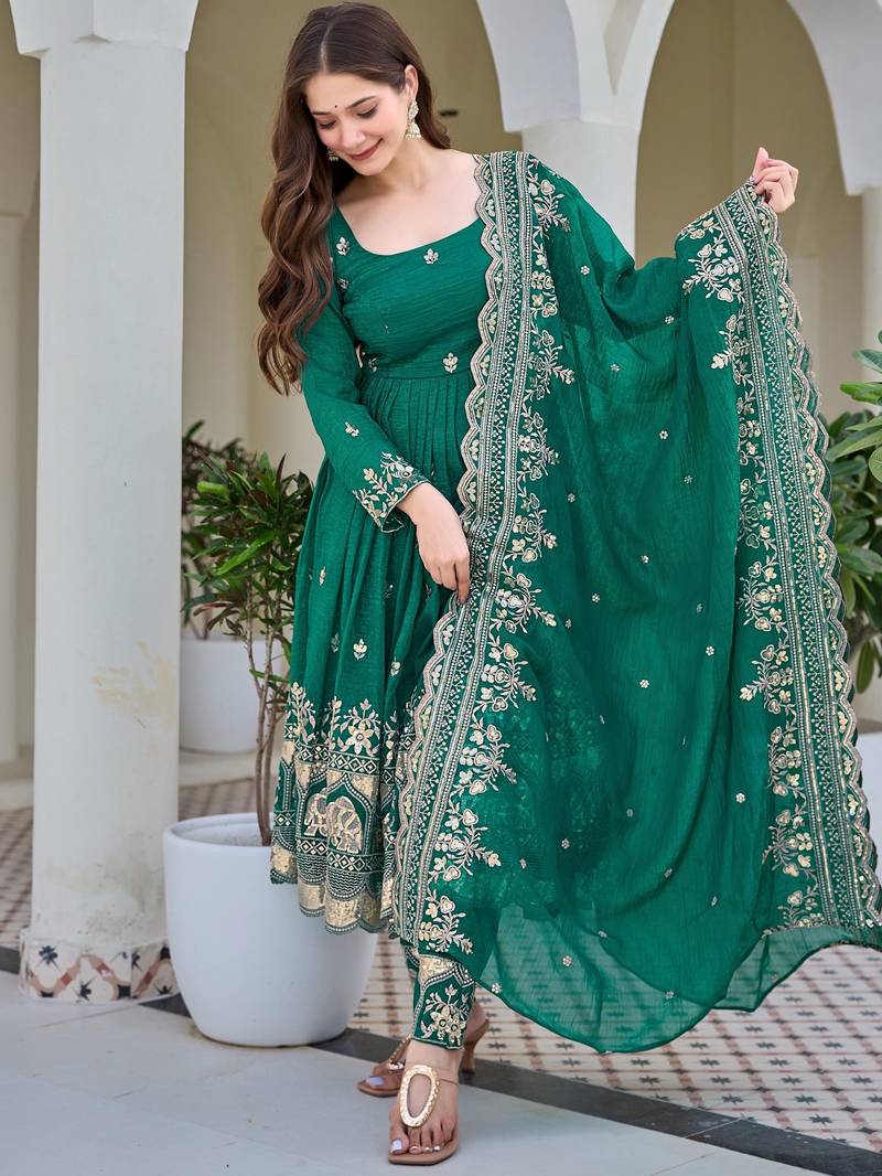 The Anarkali Is Made From Rich Emerald Green Heavy Silk Fabric With Designer Embroidery, Sequin And Thread Detailing In Soft Gold Tones. It Includes A Soft Micro Inner Lining And Is Ready To Wear In Sizes M (38), L (40), Xl (42), And Xxl (44).