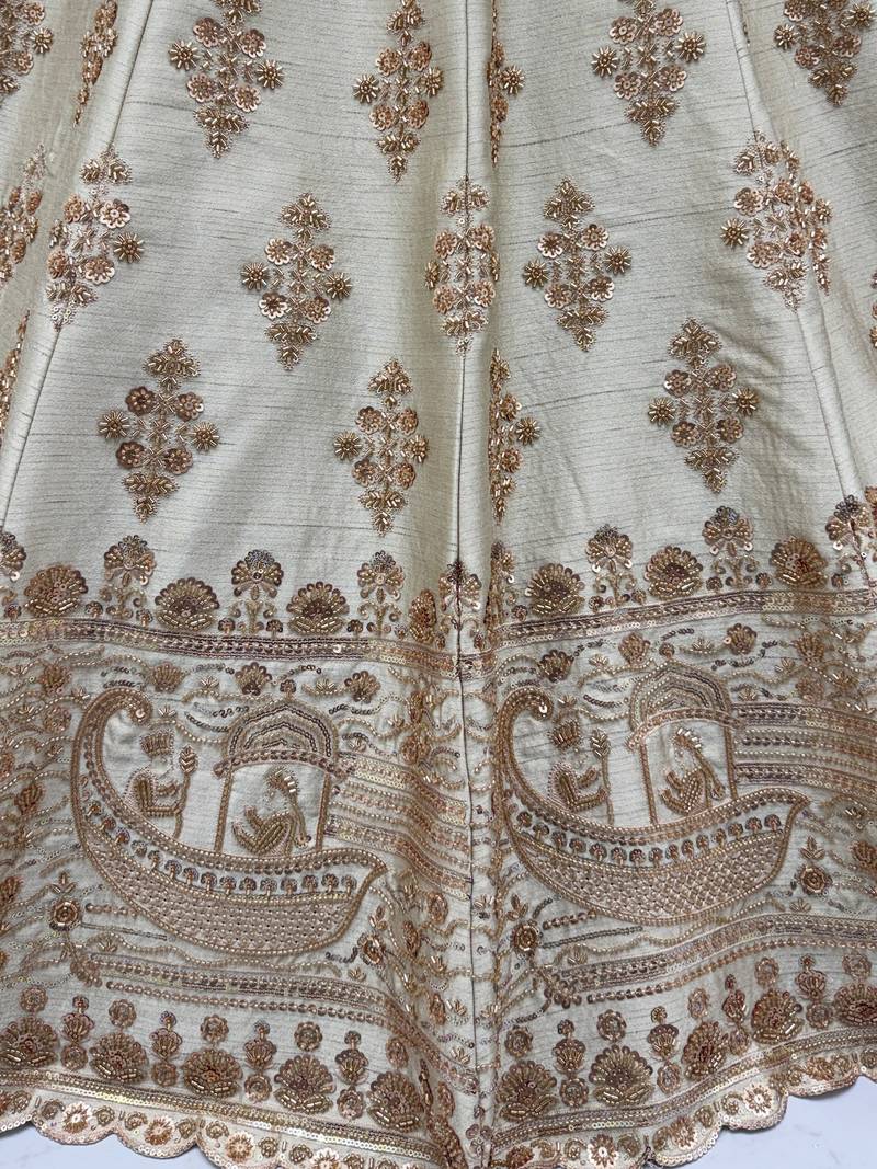 | Product Description | This Lehenga Features A Soft Champagne Beige Silk Lehenga Base Adorned With Intricate Antique Gold Zari Work, Creating A Subtle And Regal Look. The Detailing Includes Tones Of Light Gold, Warm Ivory, And Soft Bronze, Enhanced With Sequins And Crystal Accents For A Gentle Golden Shimmer.