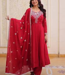 Lovable red bead work chanderi engagement wear anarkali pant suit stitched
