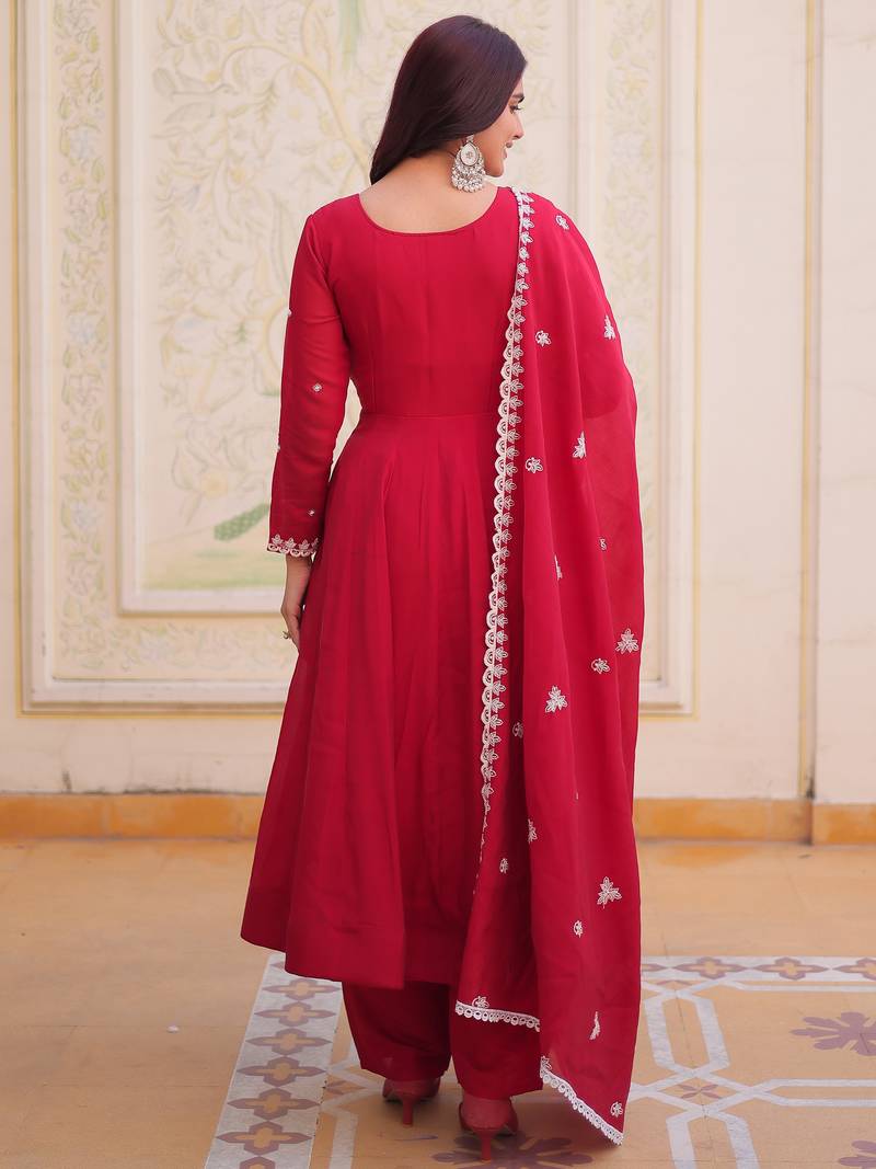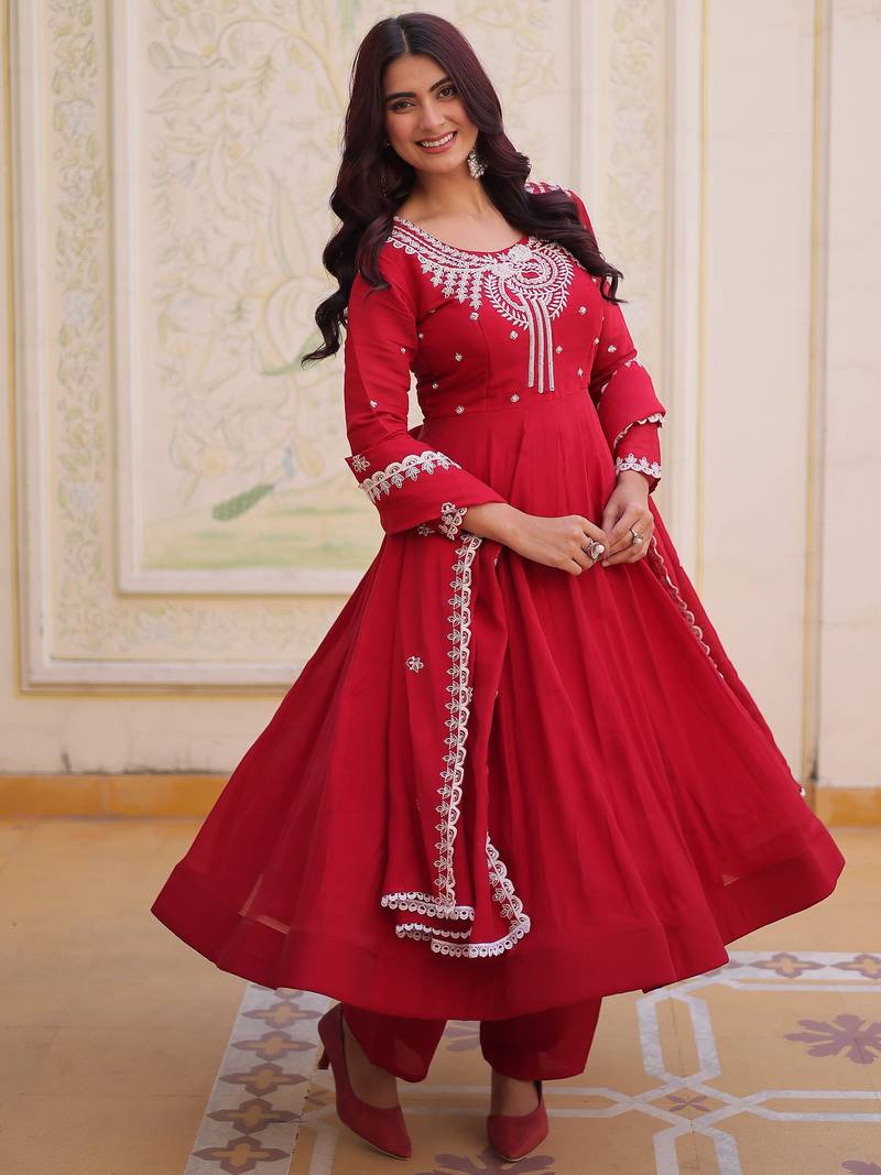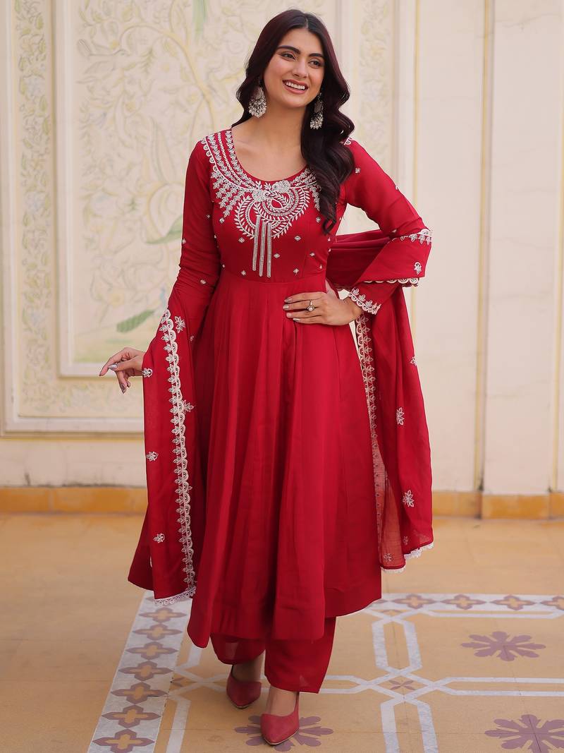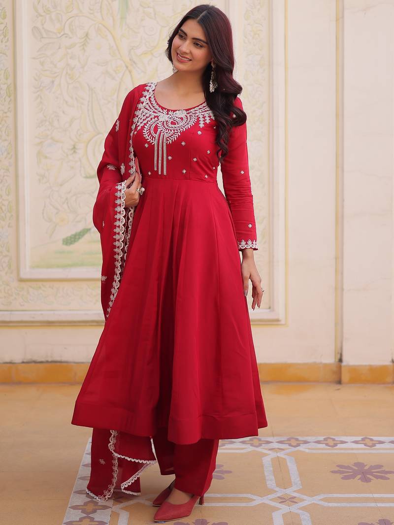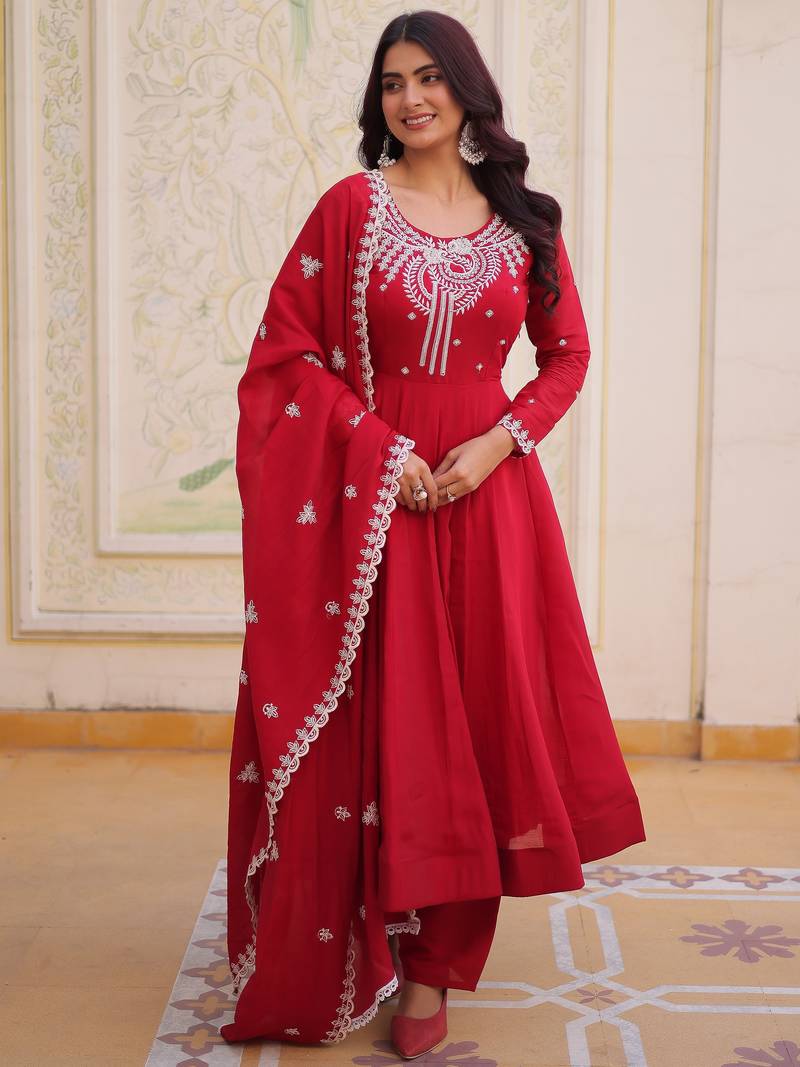 The Combination Of Deep Red Base With Subtle Silver Embroidery Detailing Creates A Timeless And Elegant Color Palette, Perfect For Festive Wear, Family Functions, And Celebrations.