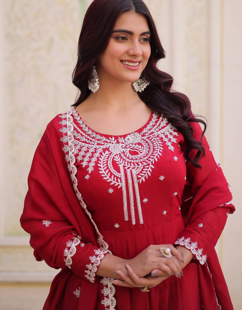 Presenting A Stunning Rich Red Gown In Mal Chanderi Fabric With Elegant Silver Bead Embroidery, Featuring Long Sleeves, Round Neck, 56 Inch Length, And 4 Meter Flair, Along With Cotton Inner And Kali Pattern Stitching, Available In M To Xxl Sizes.