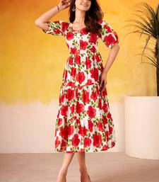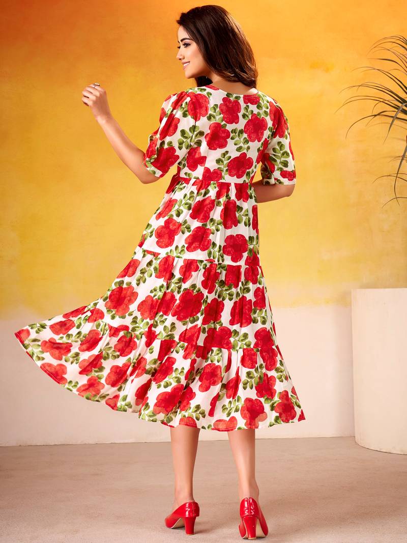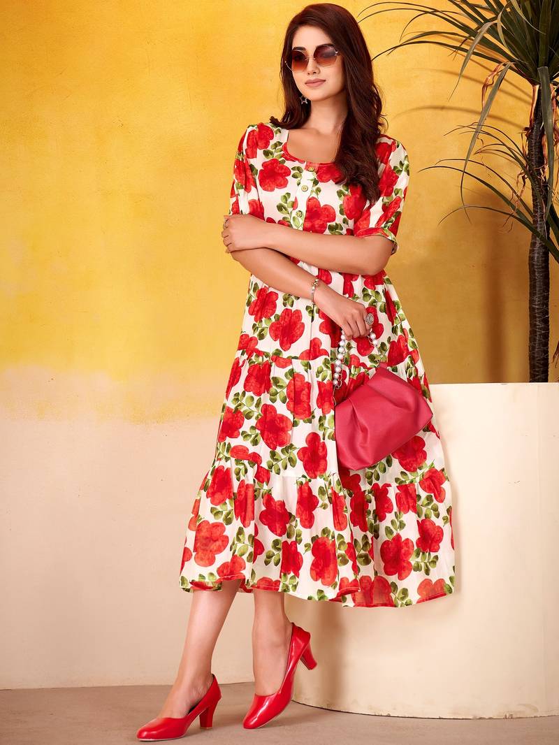 The Frock Features A Soft Off White Base Adorned With Bold Crimson Red Floral Prints And Subtle Olive Green Leafy Accents, Creating A Vibrant And Eye Catching Look. Made From Vichitra Silk, It Is Available In Sizes M (Up To 40), L (Up To 42), And Xl (Up To 44) With A 45 Inch Length And 5 Meter Flair.
