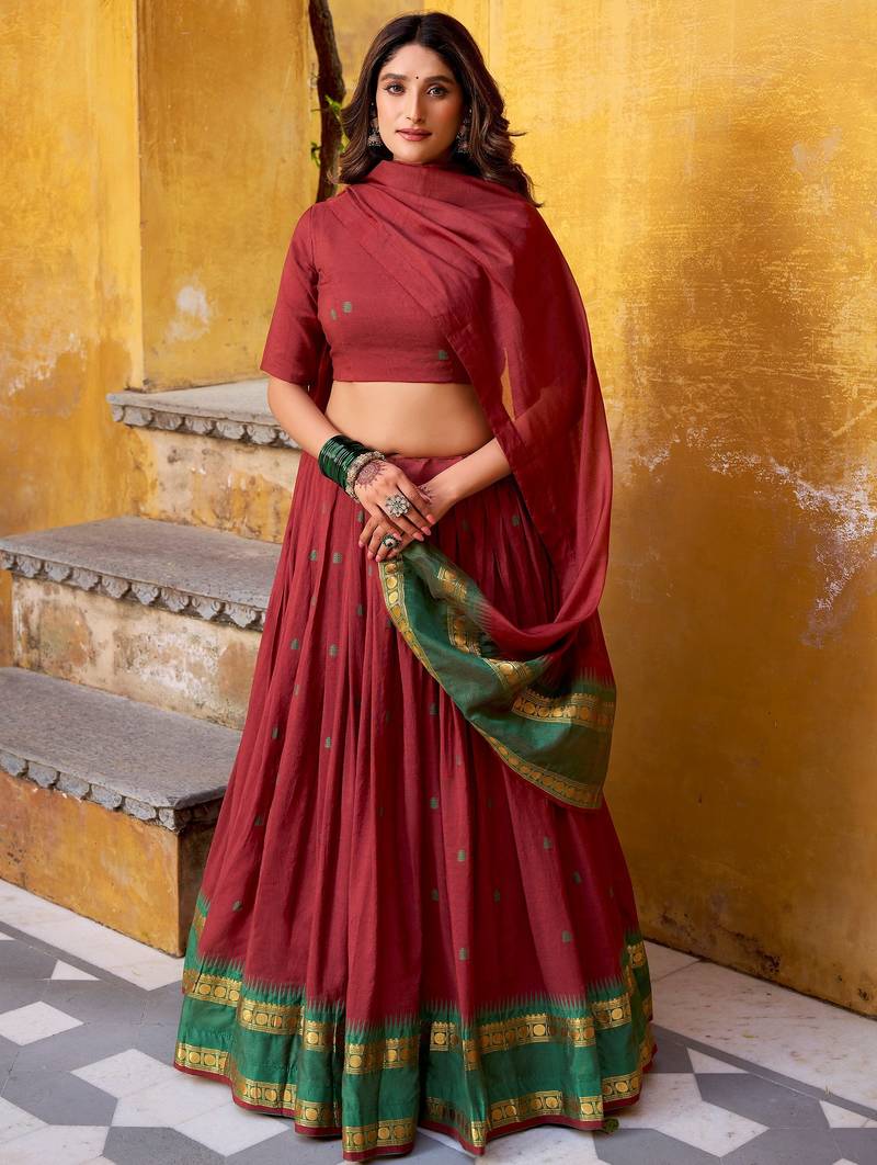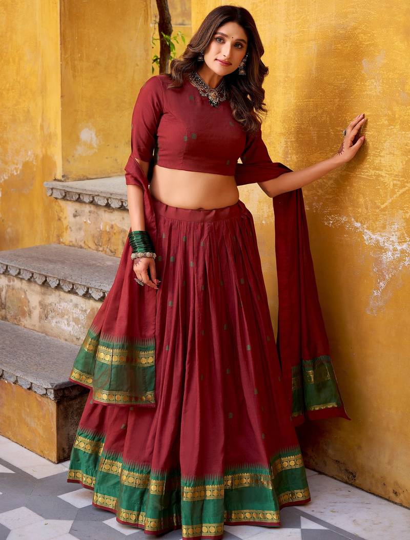 | Product Description | The Lehenga Is Designed In A Rich Deep Maroon Shade, Beautifully Complemented With A Green Border Featuring Gold Zari Weaving, Creating A Striking Traditional Contrast. With A 4 Meter Flair And 41 Inch Length, It Supports Waist Sizes Up To 42 Inches And Offers A Graceful Flow.