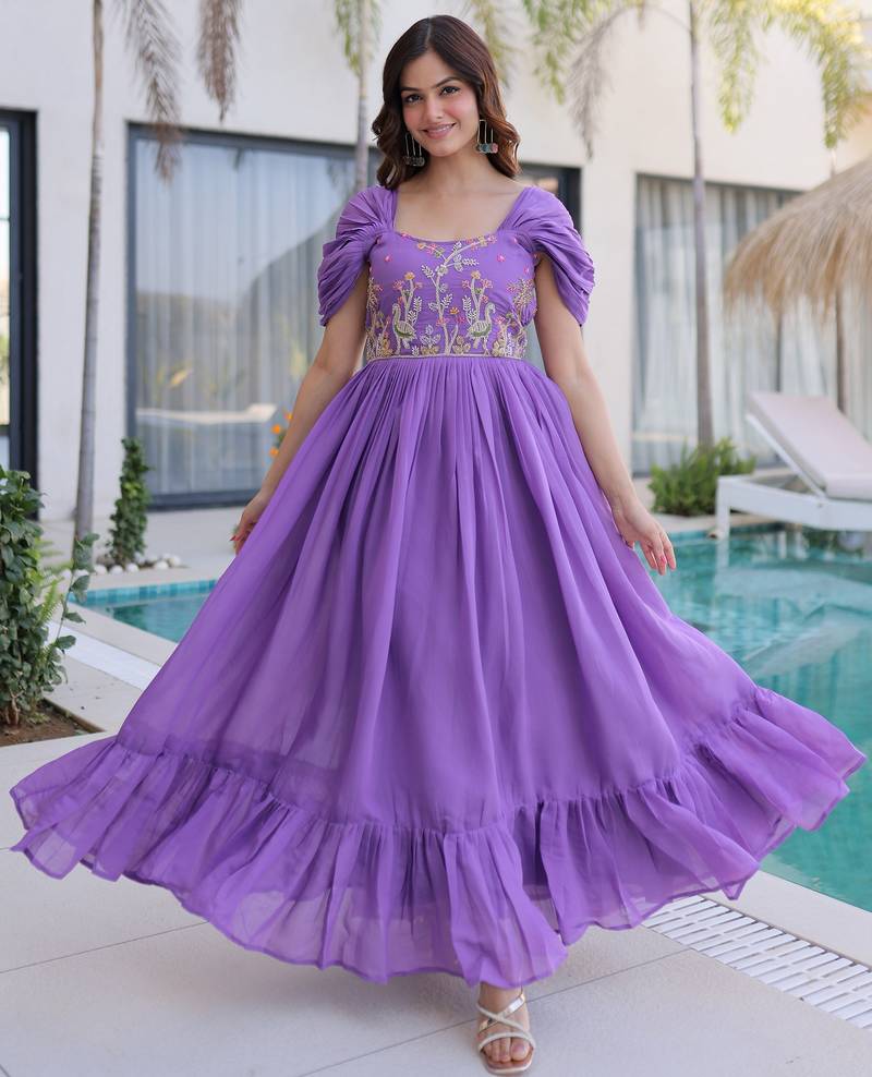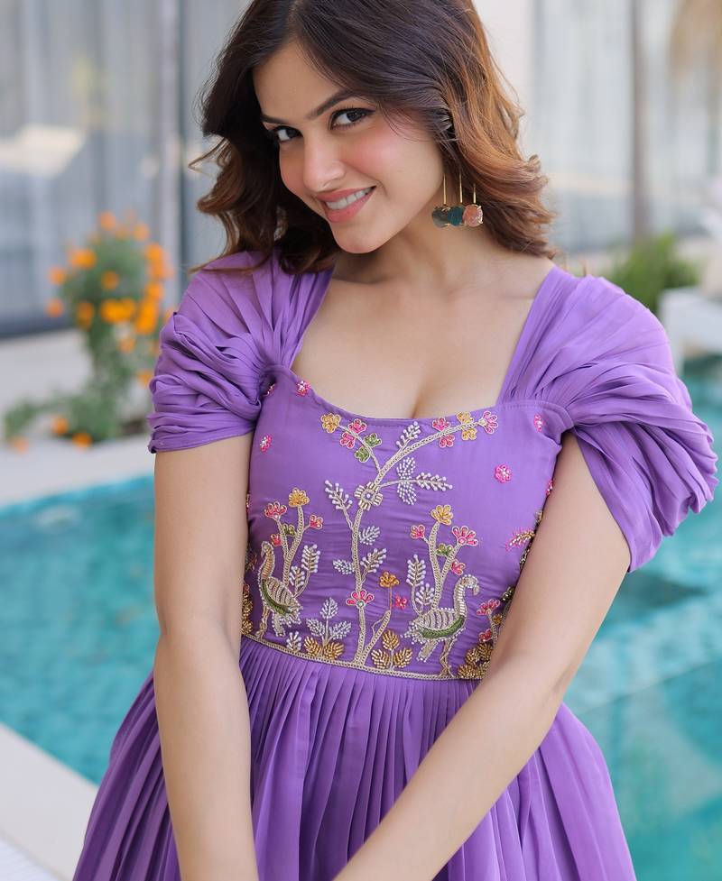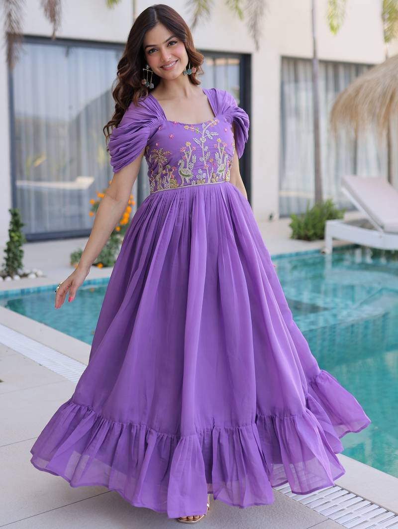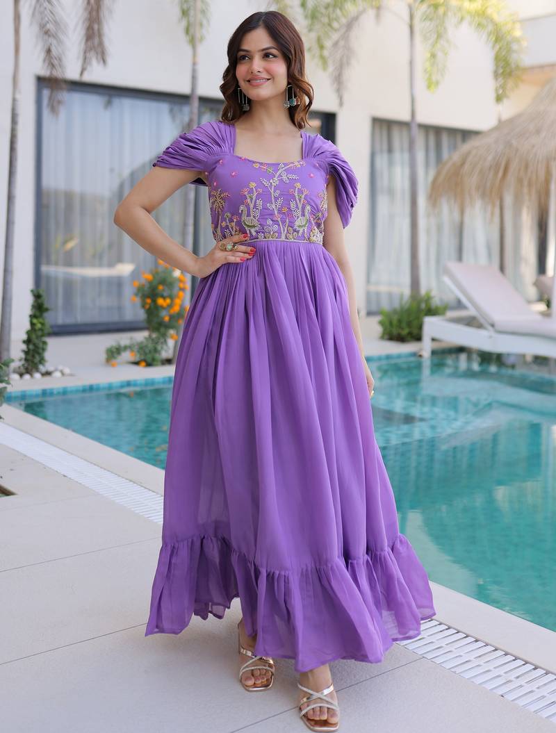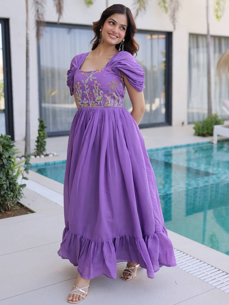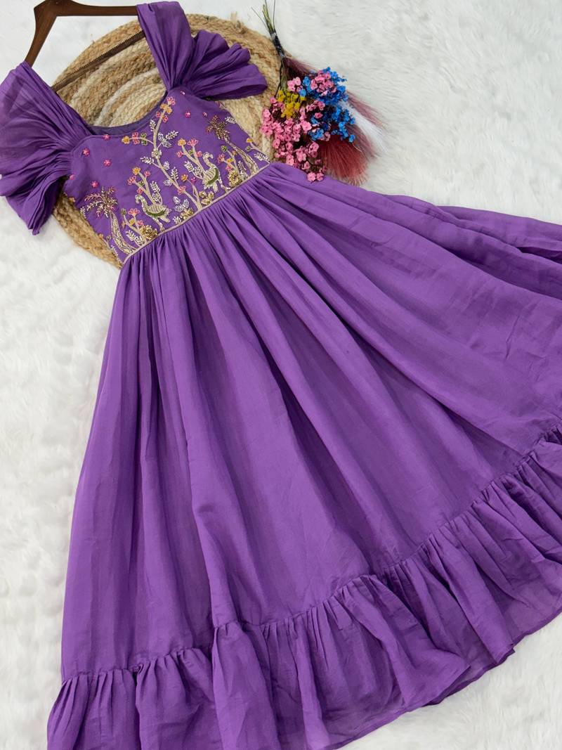 Notable purple bead work chanderi festive wear dress stitched
