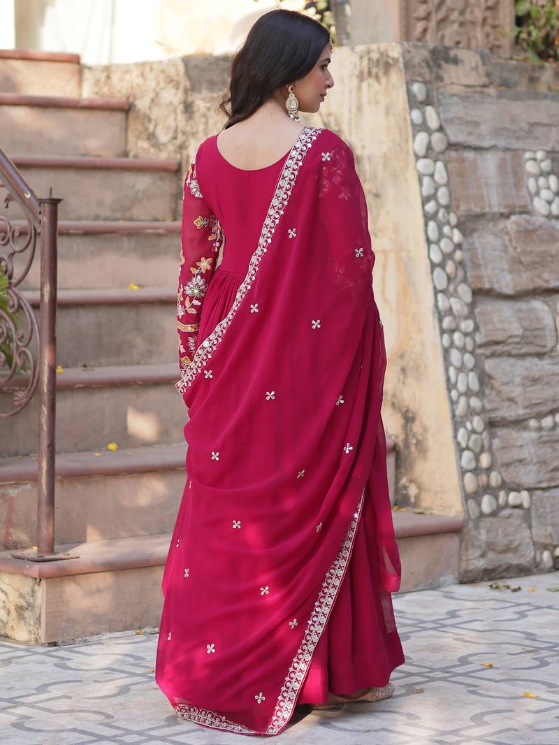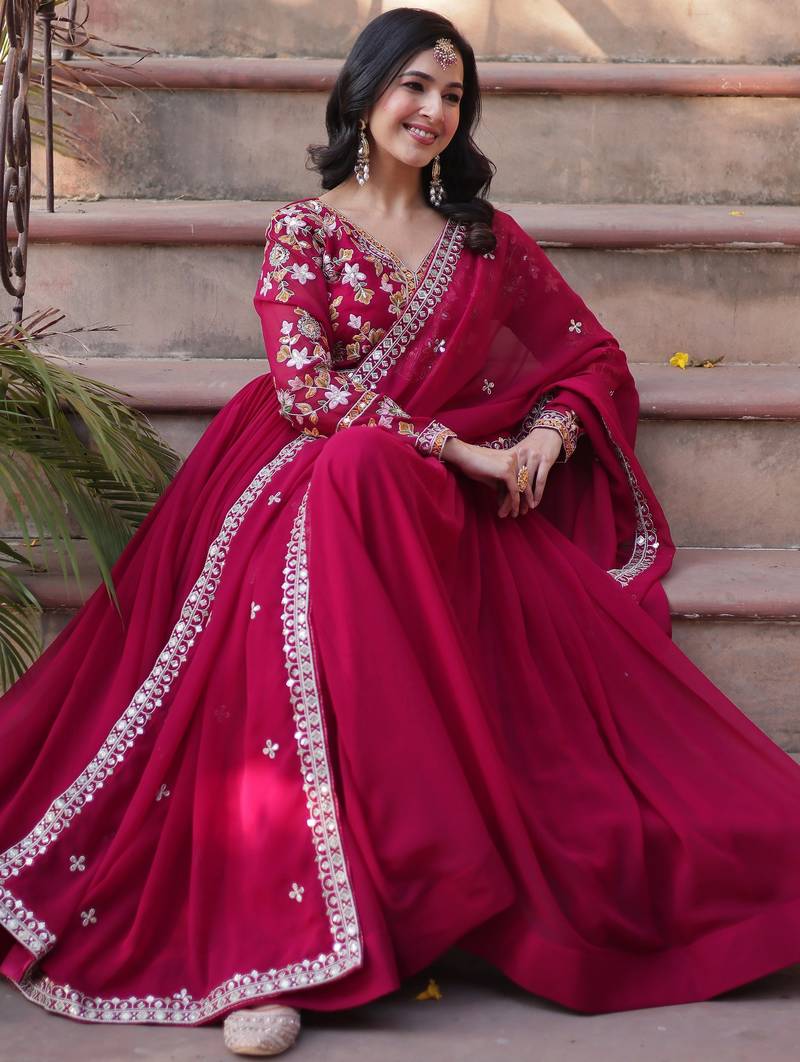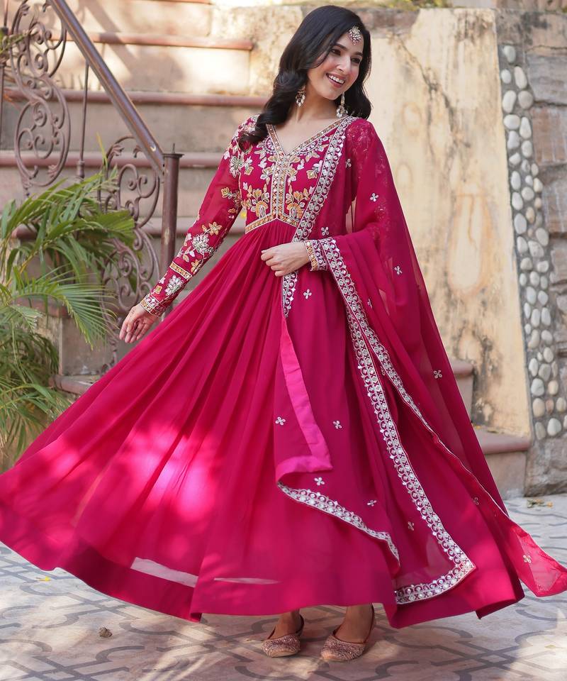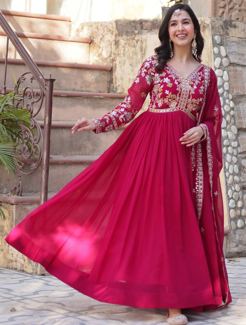 The Gown Features A Rich And Vibrant Rani Pink Shade, Giving It A Bright And Festive Appeal. The Upper Bodice Is Beautifully Enhanced With Intricate Floral Embroidery In Tones Of Gold, Peach, Green, And Subtle White.