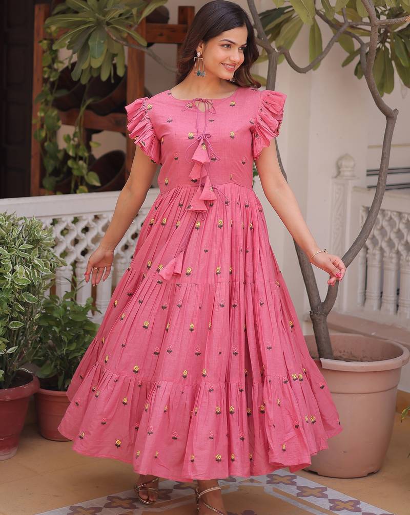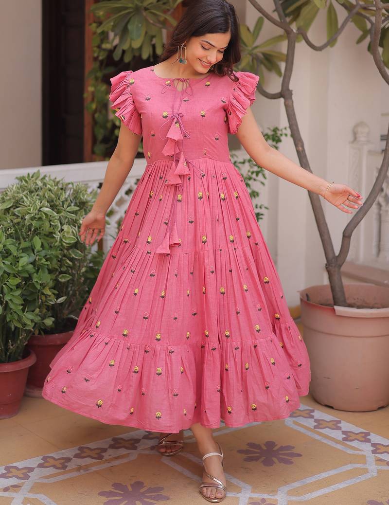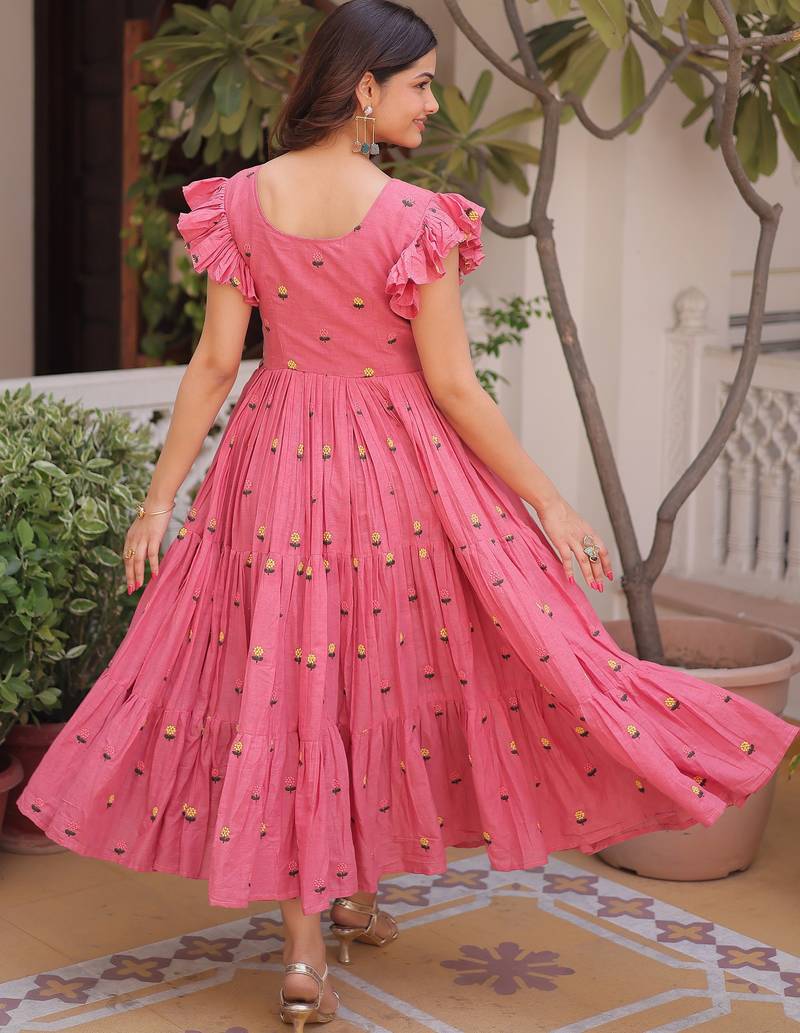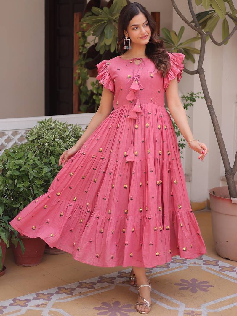 The Lower Flare Continues In The Same Rose Pink Tone With Evenly Spread Floral Embroidery. The Tiny Yellow And Green Motifs Add A Lively Yet Subtle Contrast.