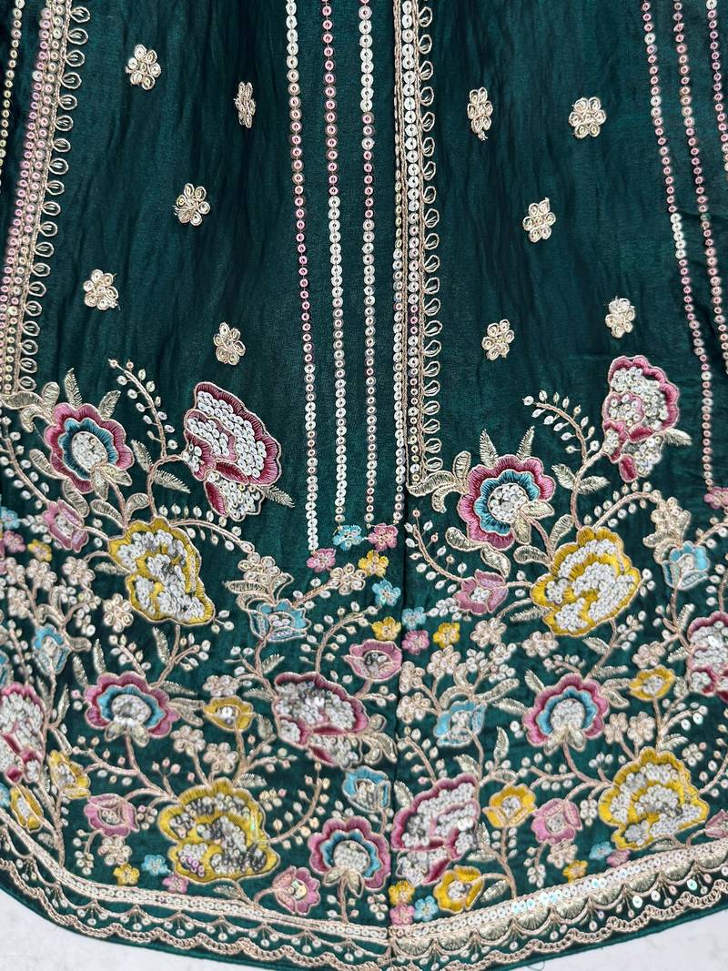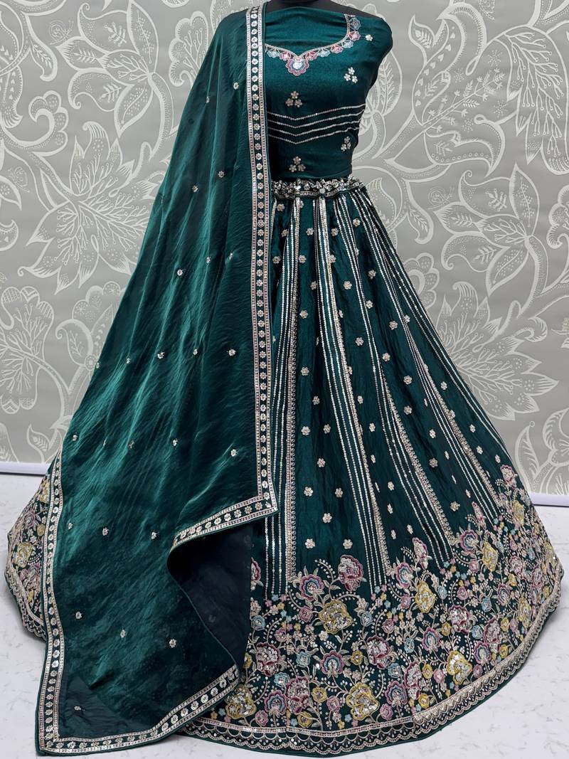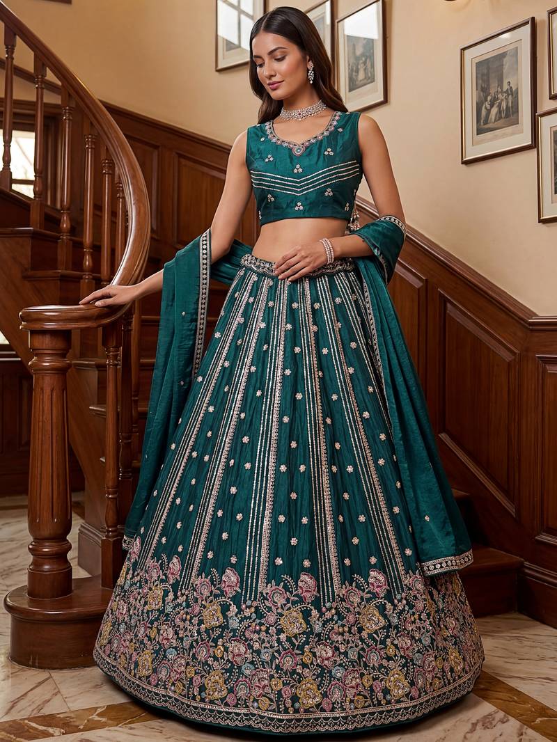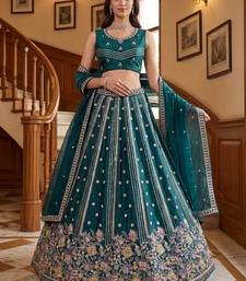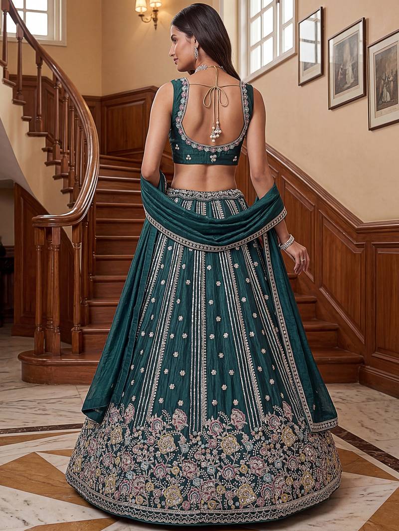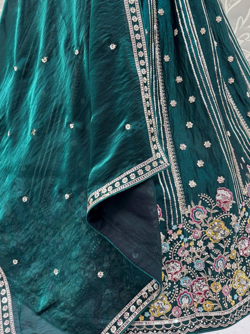 | Product Description | The Lehenga Is Designed In A Rich Deep Teal Green Organza Fabric, Beautifully Highlighted With Dori Embroidery, Multi Thread Floral Detailing, Zari Work, And Subtle Sequin Accents That Enhance Its Graceful Look.