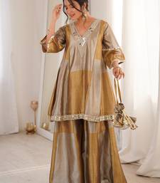 Stylish golden mirror work tissue wedding wear palazzo suit stitched