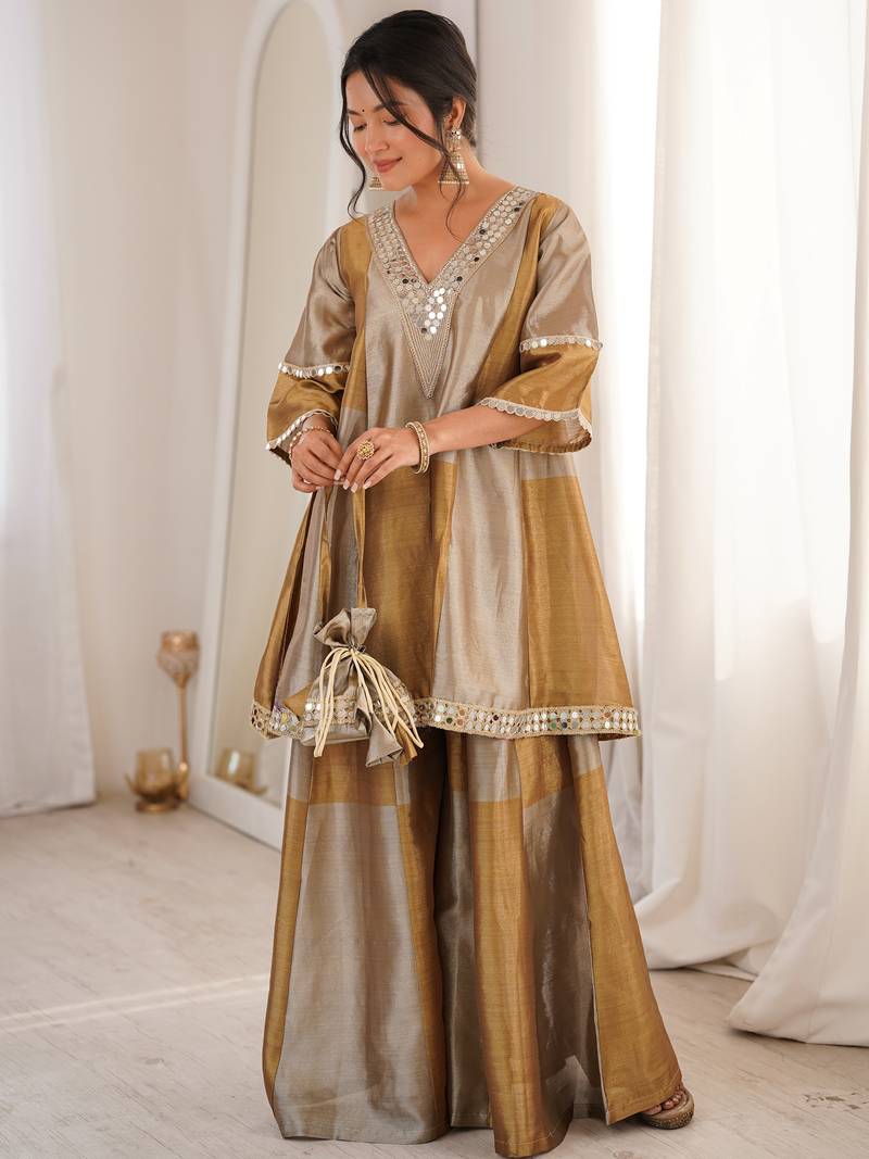 Stylish Golden Mirror Work Tissue Wedding Wear Palazzo Suit