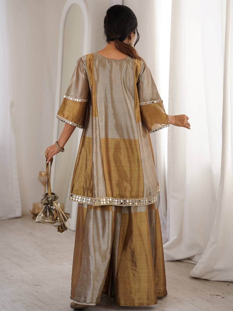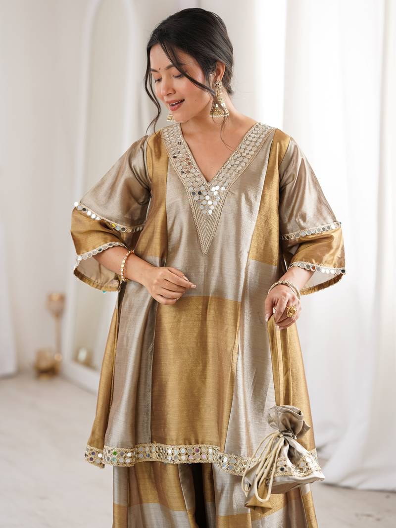 The Kurta Showcases A Rich Mix Of Metallic Gold Panels Blended With Soft Beige Undertones, Enhanced By Subtle Mirror And Thread Accents, Giving It A Classy, Festive Shimmer.