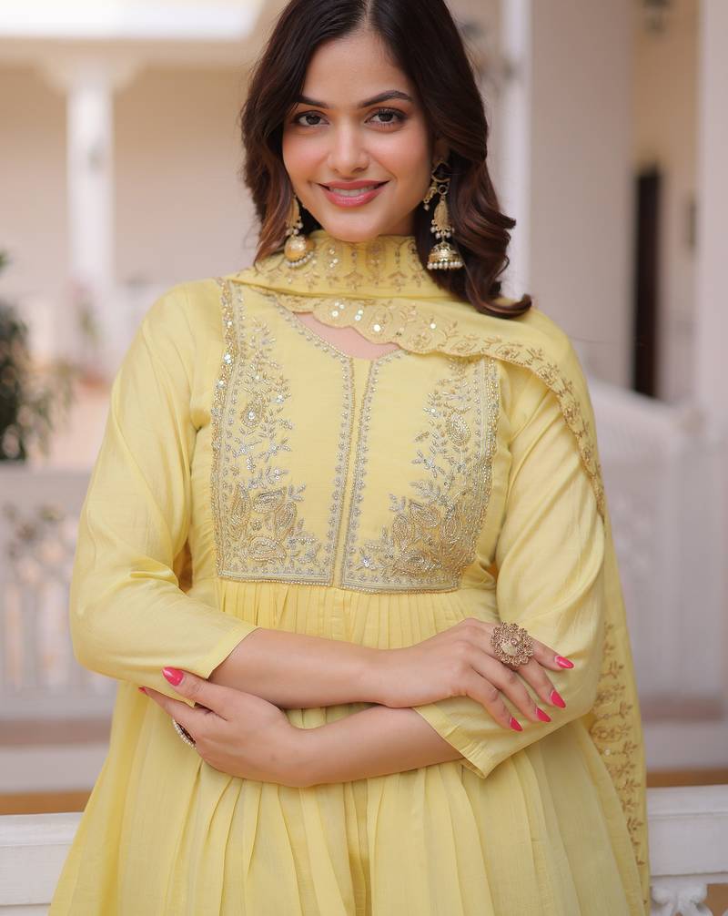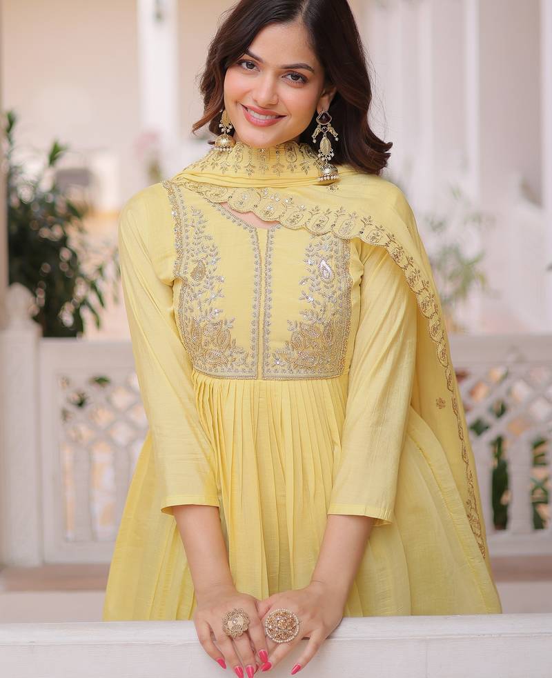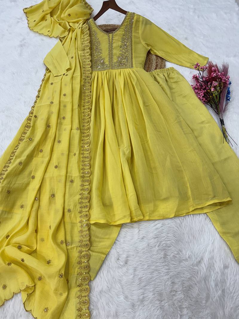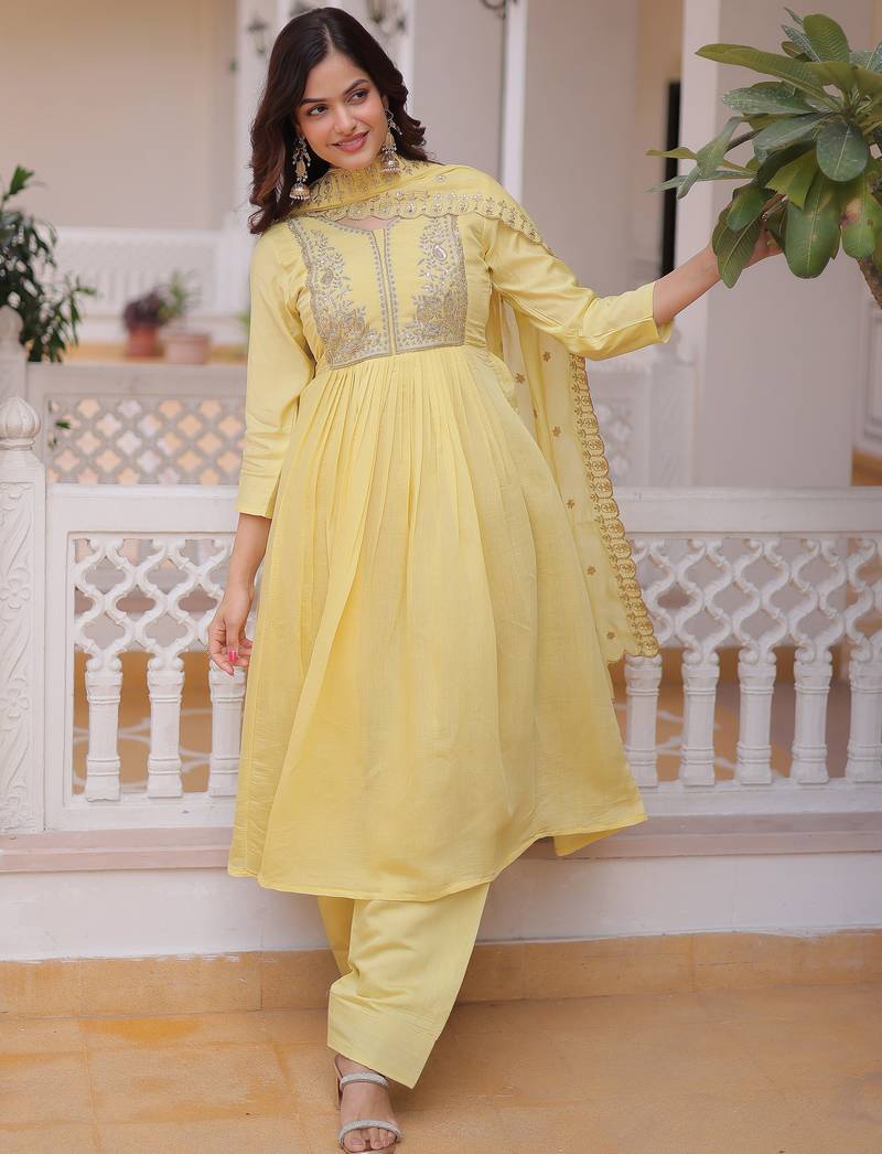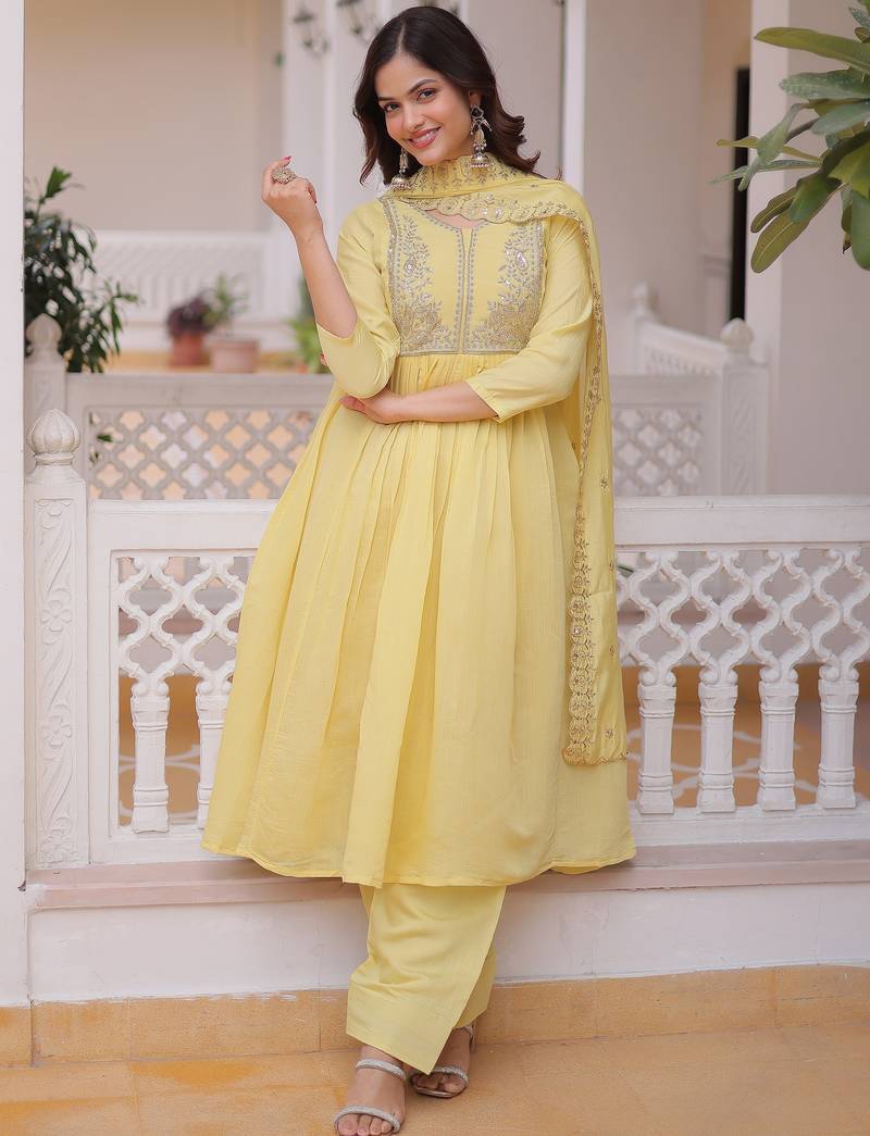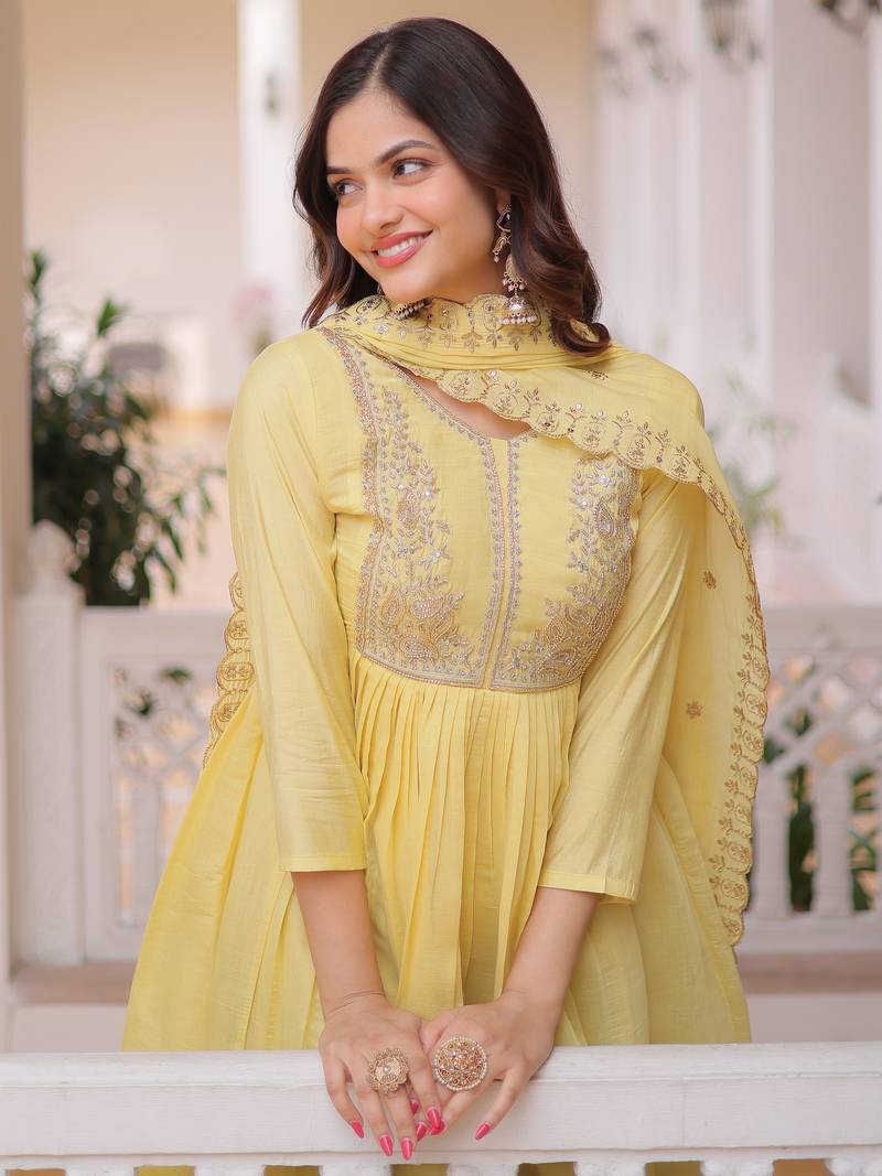 The Outfit Is Designed In A Refreshing Lemon Yellow Shade, Offering A Bright And Elegant Festive Appeal. The Top Is Available In M (38”), L (40”), Xl (42”), And Xxl (44”), With A Graceful 46 Inch Length That Flatters Multiple Body Types.