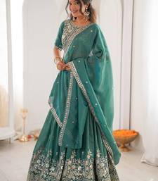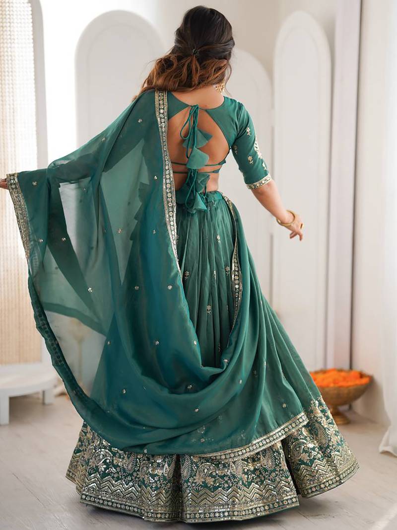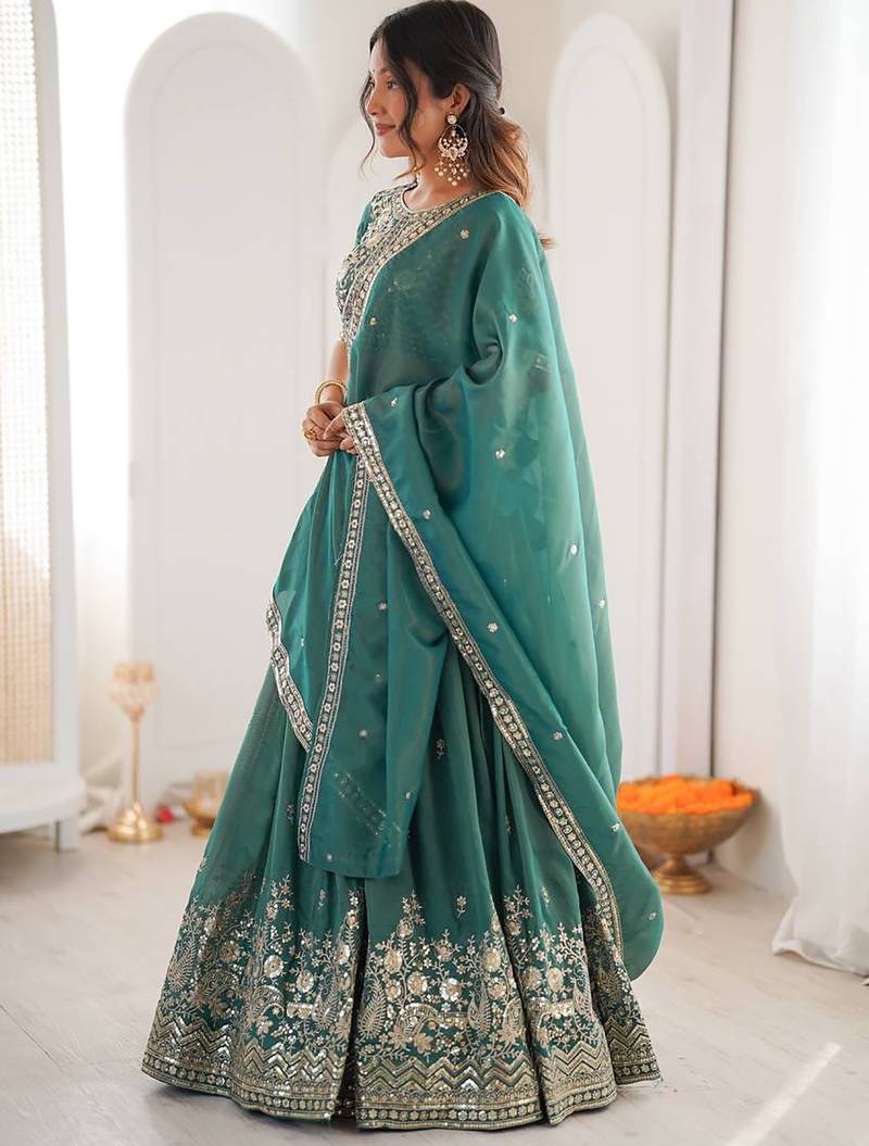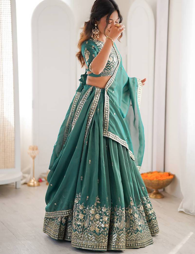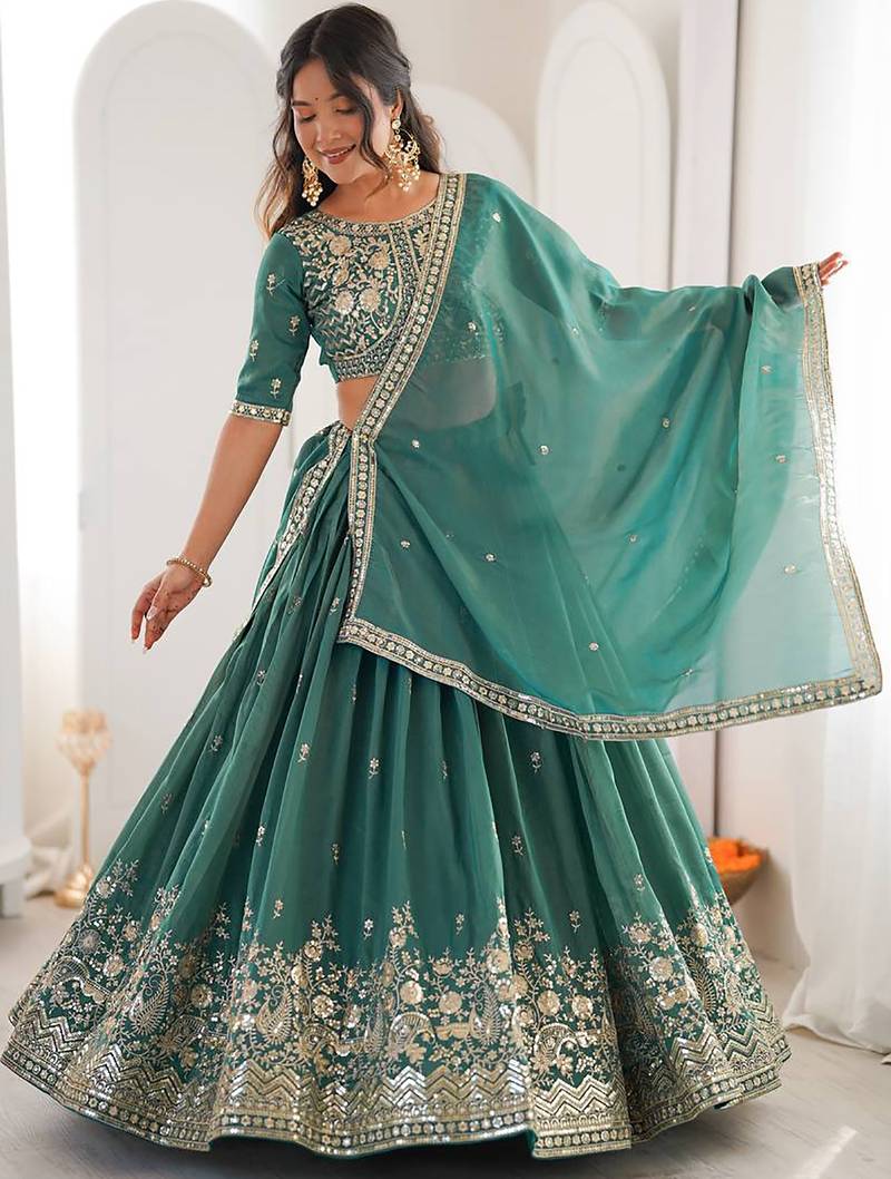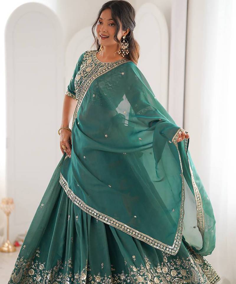 | Product Description | The Lehenga Is Designed In A Rich Sea Green Shade, Offering A Graceful And Regal Appeal. The Border Is Beautifully Enhanced With Intricate Thread And Sequence Work In Antique Gold Tones, Adding Depth And A Luxurious Finish.