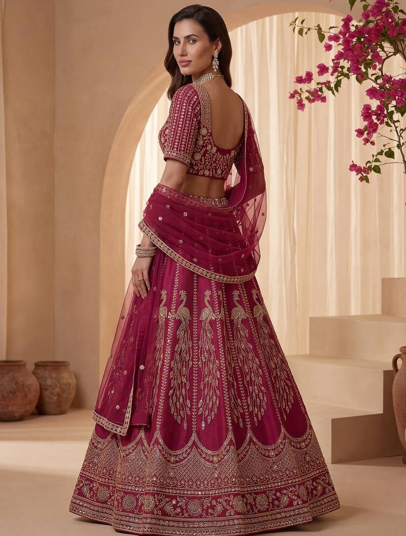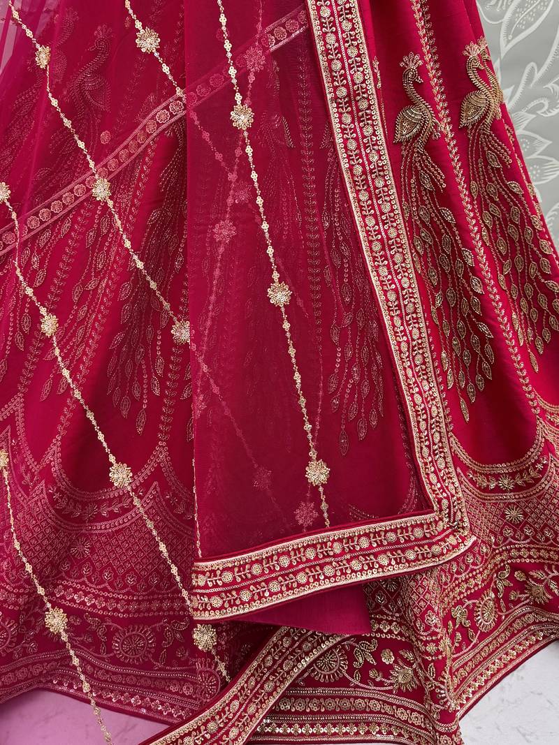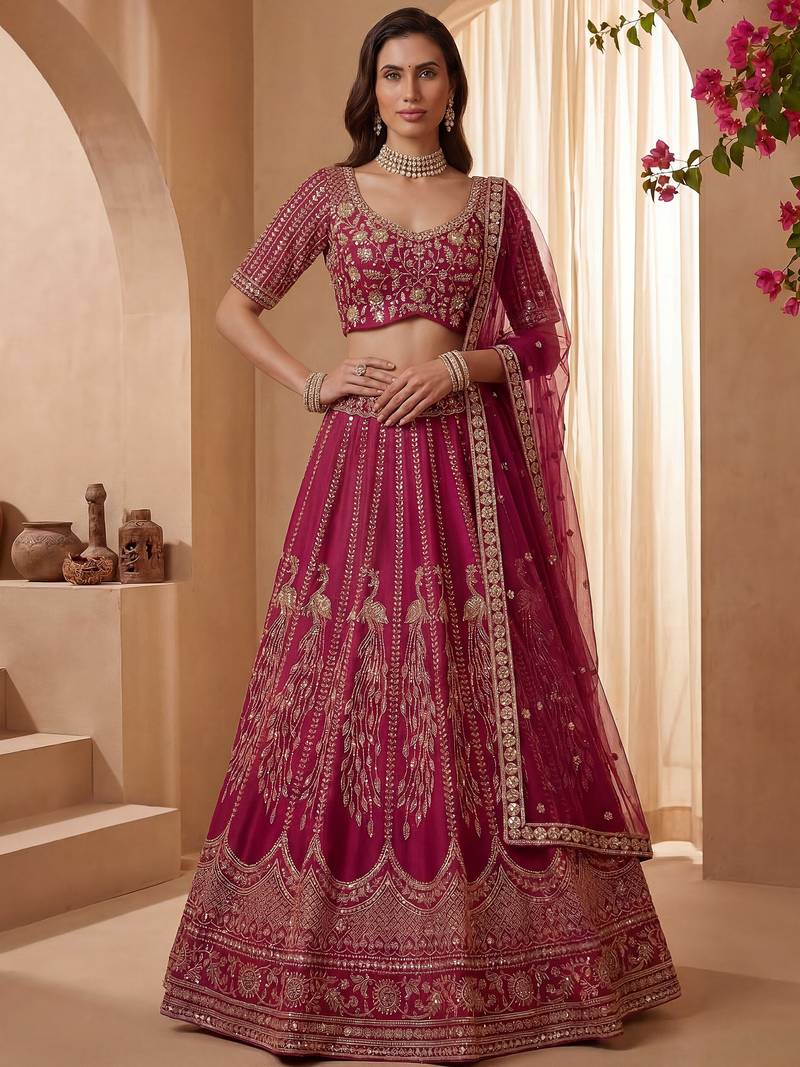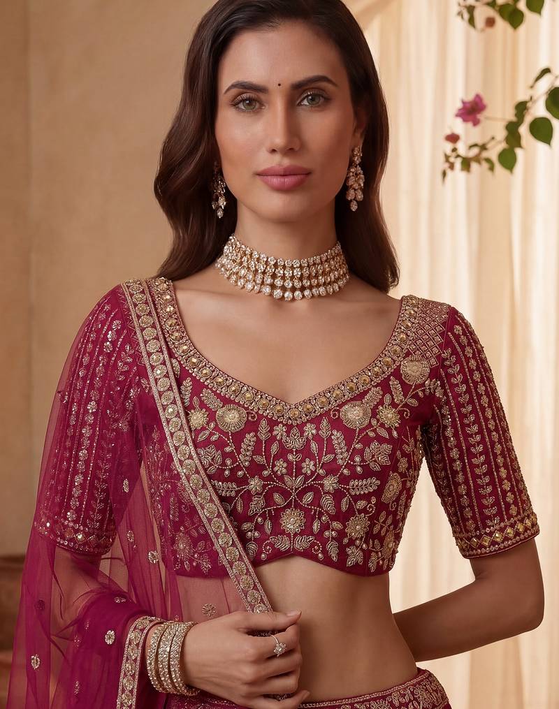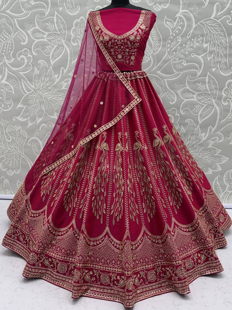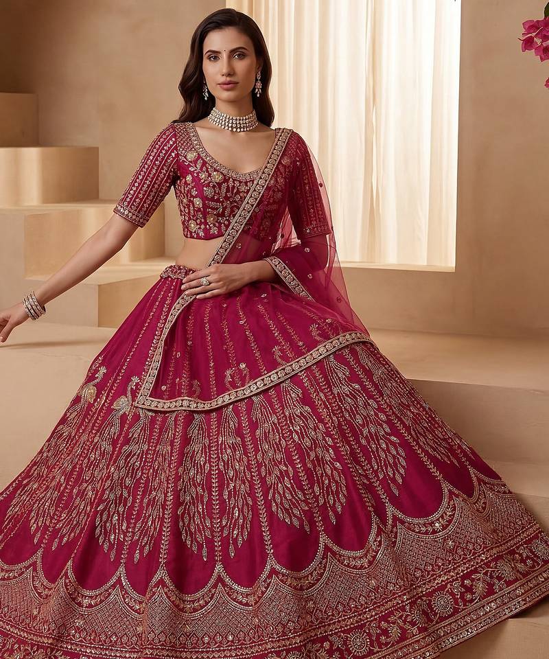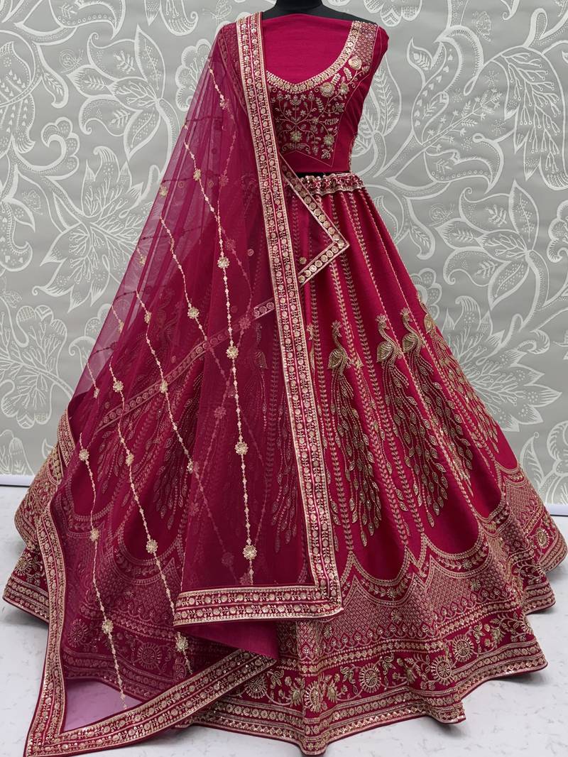 | Product Description | Radiating In A Vibrant Rani Pink Silk Lehenga, The Outfit Is Beautifully Highlighted With Intricate Gold Zari, Crystal, Sequins, And Multi Thread Embroidery, Creating A Rich And Eye Catching Contrast. This Lehenga Can Be Customized Up To 42 Inches For A Perfect Fit.