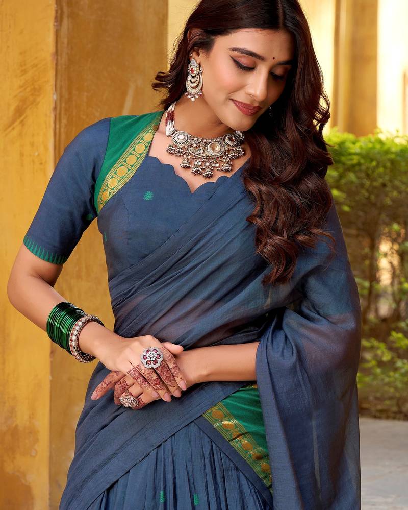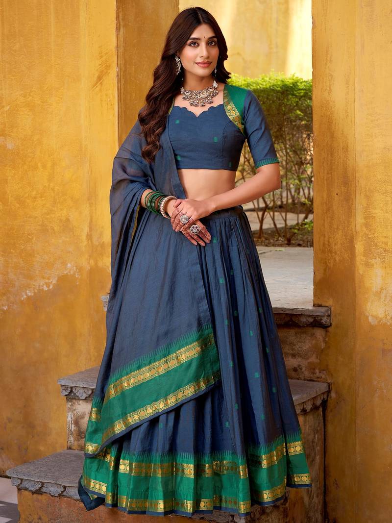 | Product Name | Wonderful Navy Blue Zari Weaving Chanderi Event Wear Half Saree Lehenga | |