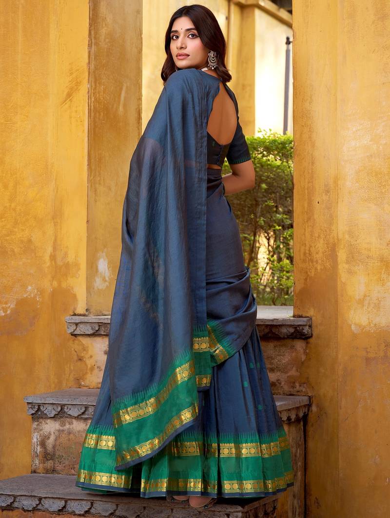 | Product Description | The Lehenga Is Styled In A Deep Steel Blue Shade, Beautifully Accented With A Rich Green Border And Gold Zari Weaving, Creating A Bold Yet Elegant Contrast. With A 4 Meter Flair And 41 Inch Length, It Supports Waist Sizes Up To 42 Inches, Ensuring A Graceful Silhouette.