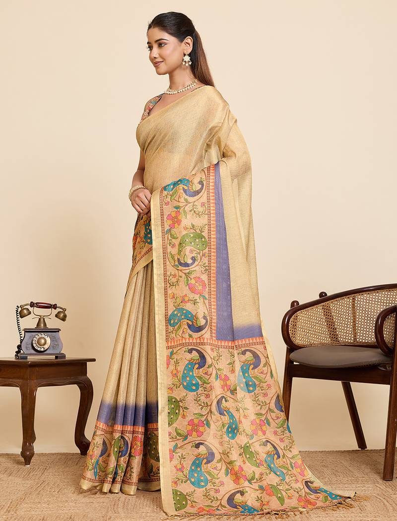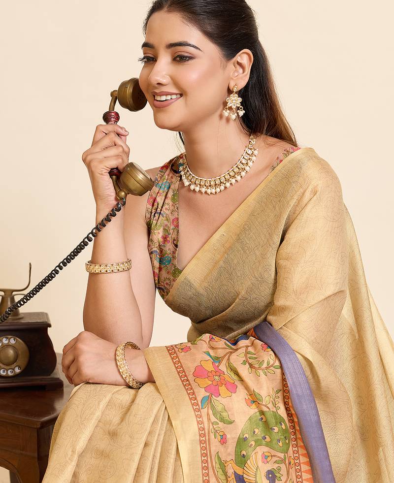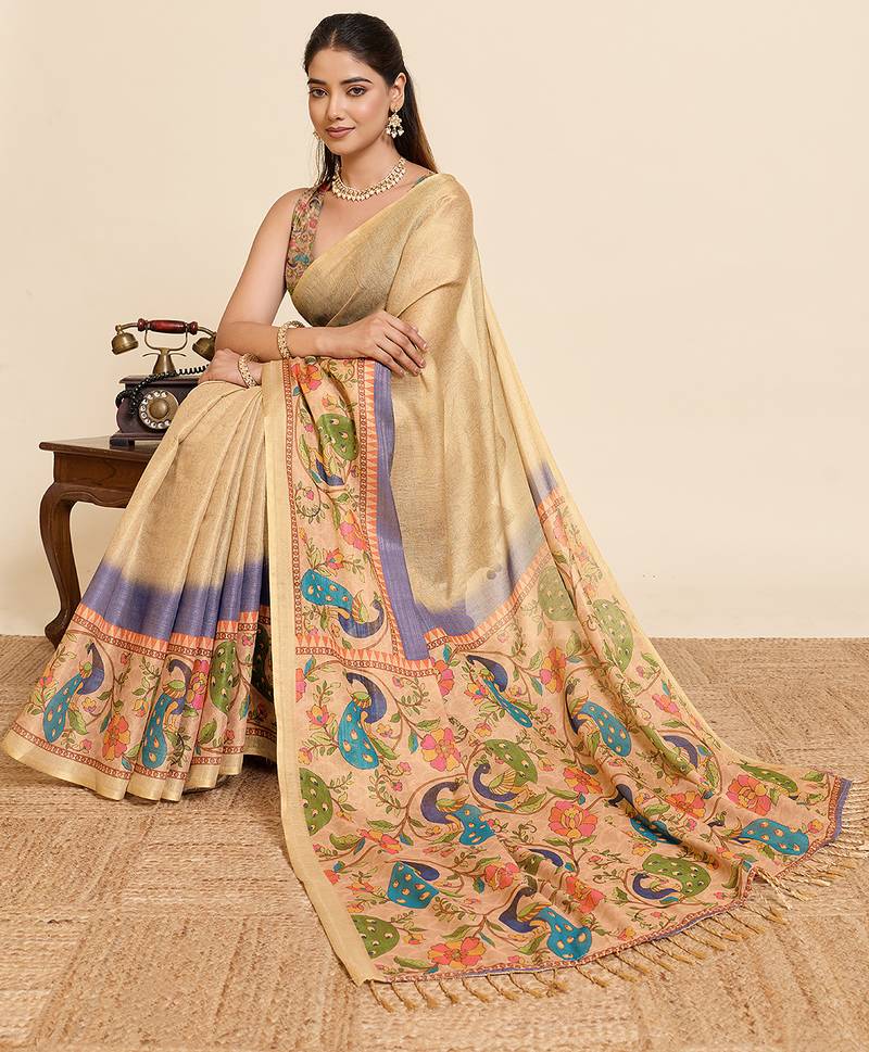 Elegant beige floral and swan print linen blend saree with unstiched blouse piece