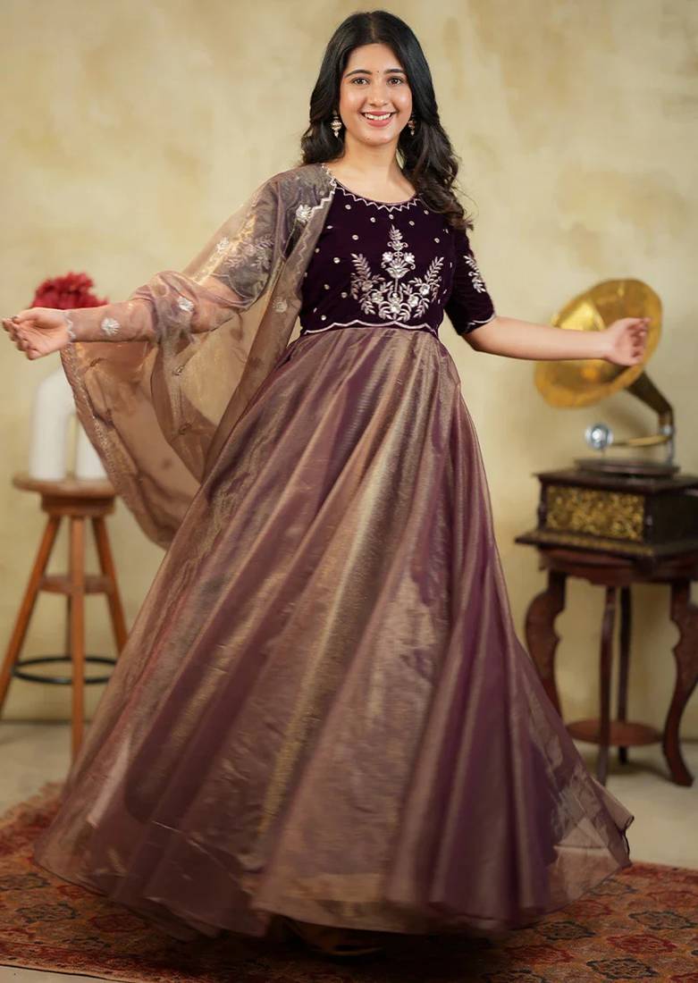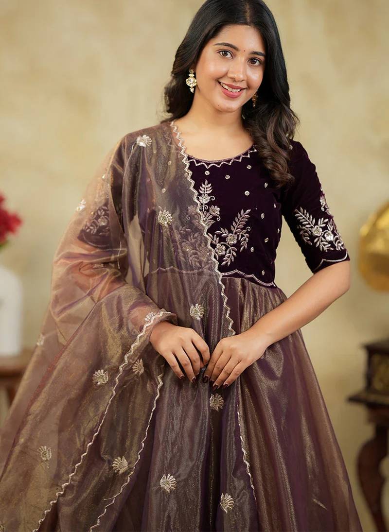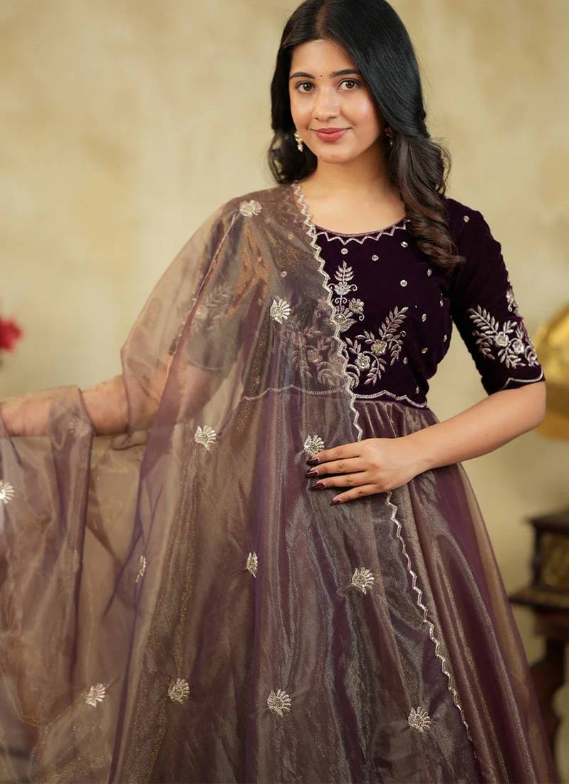 | Product Name | Elegant Wine Brown Embroidered Velvet With Soft Net Anarkali Gown With Dupatta | |